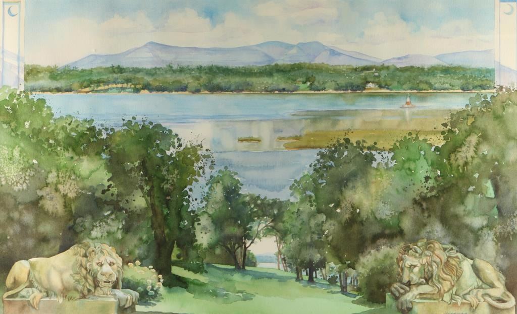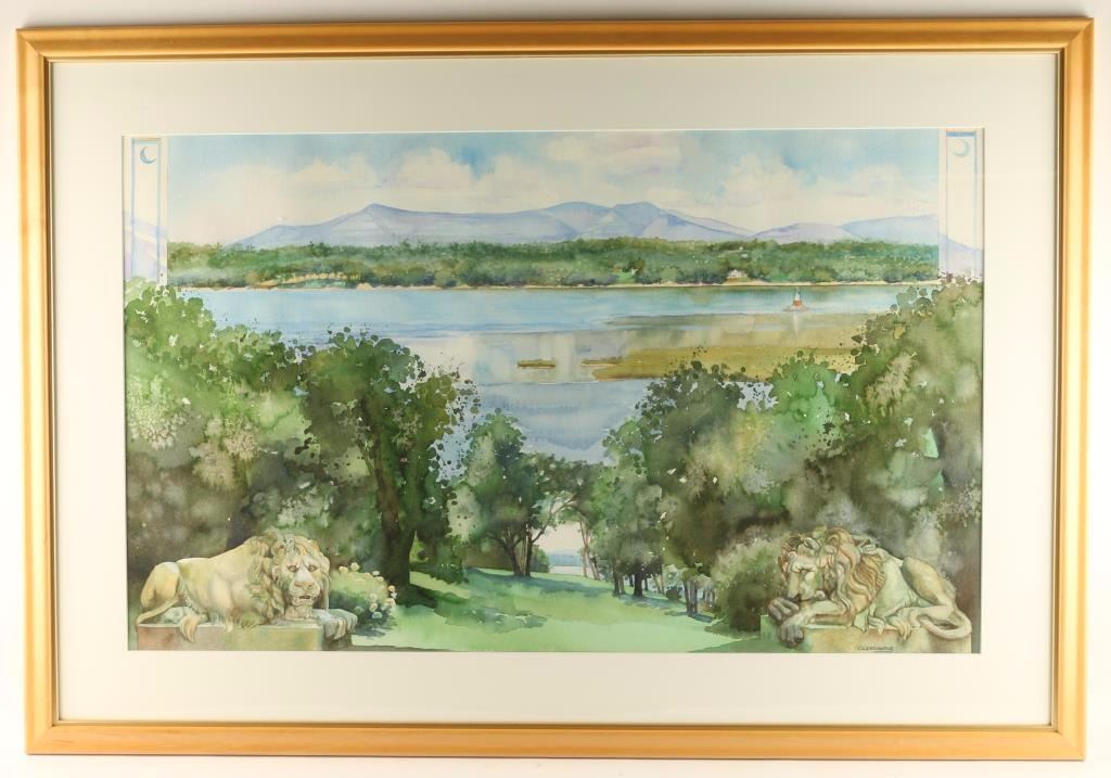 Artist Christine Debroski entitled "Elements of Clermont" depicting lakeside scene with stone monuments of lions. Hand signed lower right. Image size 36"x22 1/2" with white mat and wood frame. Christine Debrosky of Tillson, New York is known for the effects of light in her landscape paintings.  She has the ability to see and capture the transient effect of natural light, which transforms the ordinary to extraordinary.  She is a signature member of the Pastel Society of America and the Pastel Society of the West Coast. Christine's contemporary impressionist paintings have been selected for, and honored with awards in numerous regional, national and international exhibitions.
