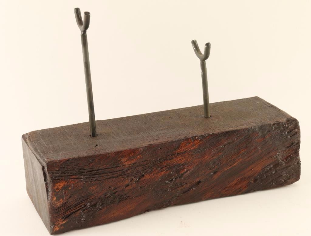 Dark stained wood with rustic unfinished log texture to front side of stand with two metal rods with cradles to hold pistol. Measures 11 1/8" x 4 1/8" x 8 1/2" at tallest armrest. Made by a local AZ artist.