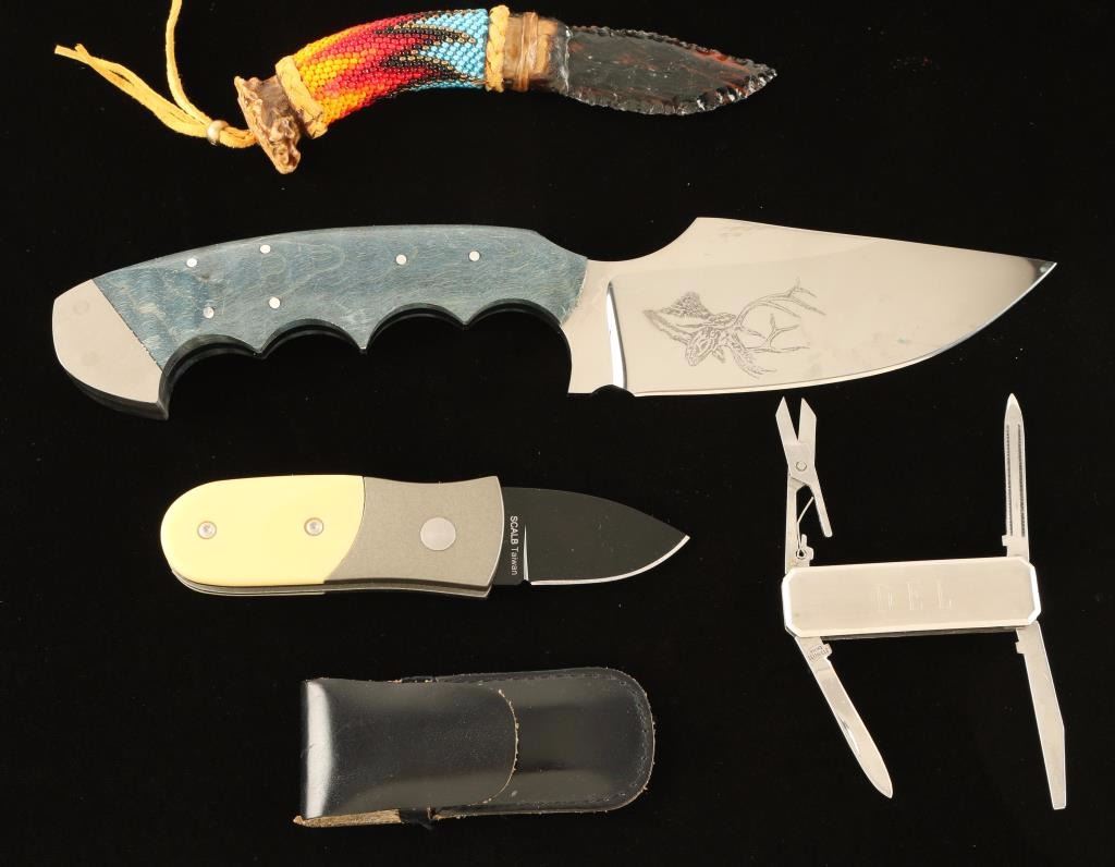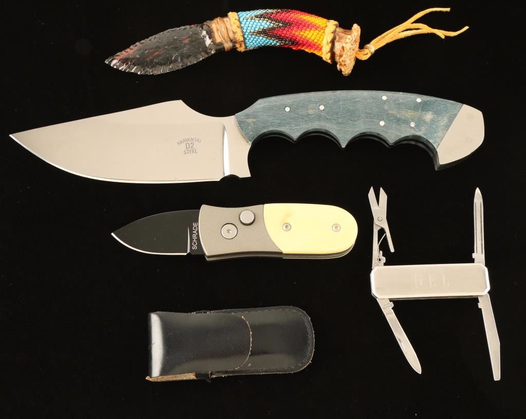 (1) 'Barminski D2 Steel' hunting/skinning knife with etched elk on blade with composite blue handle. 4 1/4" blade measures 9 1/2" overall. (1) Stone blade knife with a beaded design with rawhide braided handle that has a faux stag endcap. Measures 5 3/8" overall. (2) Small folding knives-Schrade push button with a faux ivory handle and small silver metal utility marked 'DEL'.