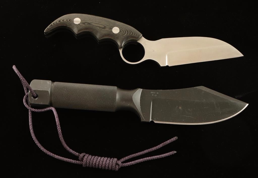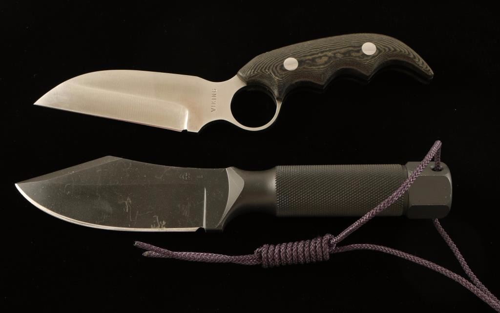 (1) 'Viking' fighting knife with grooved micarta handle and finger hole. 4" blade, measures 8 3/4" overall. (1) Fighting knife with black coated blade and textured metal handle with lanyard in bolt endcap.4" blade, measures 9" overall.