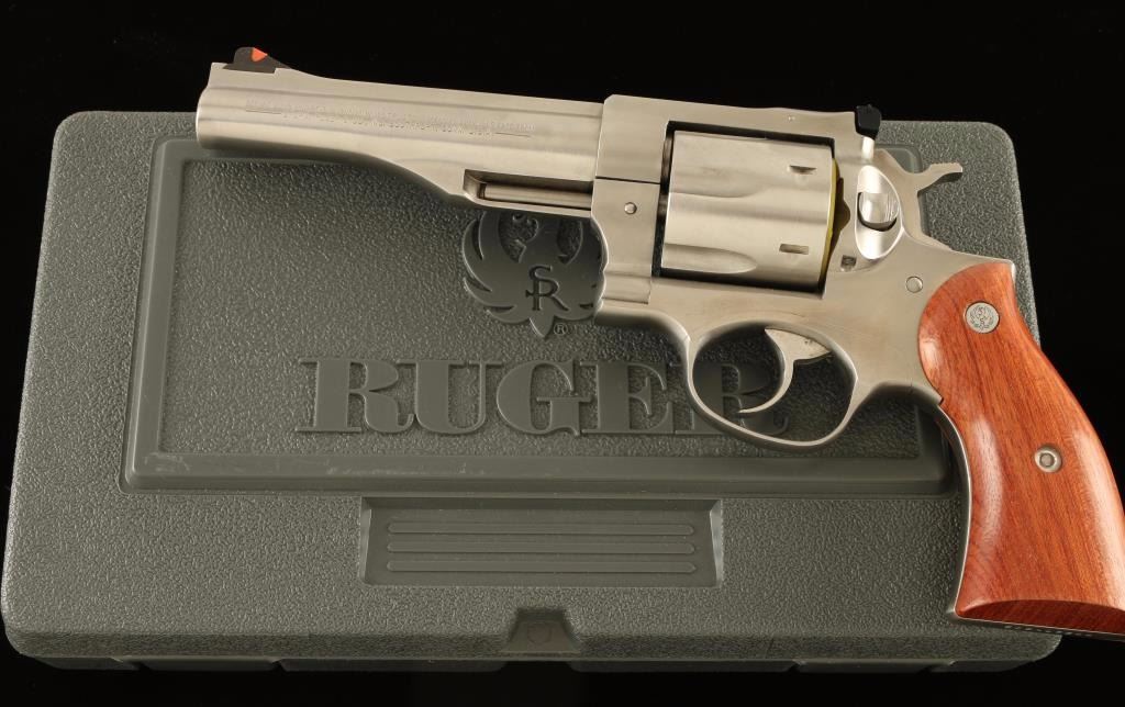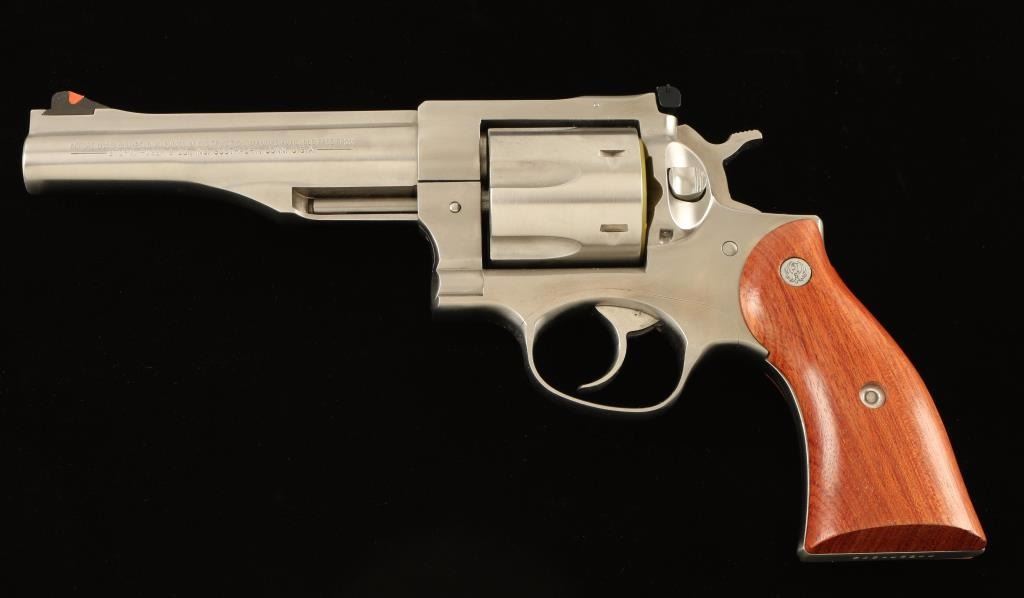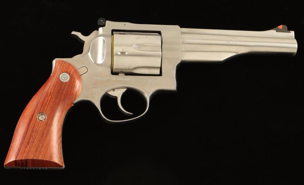Stainless steel large frame double-auction revolver chambered in .45 Colt, circa 2003. Features a brushed finish, solid ribbed 5 1/2" barrel, ramp front sight with orange insert, adjustable rear window sight with white outline, shrouded ejector rod, fluted six shot cylinder, transfer bar safety, smooth trigger, checkered hammer spur, and two-piece smooth wood grips with Ruger medallions. Includes the original factory hard case with documents, spent case and lock. Revolver exhibits little to no visible wear. Action is smooth with tight lock-up, bore is excellent and wood grips are fine. Condition is like new in box. ***Modern Firearm***