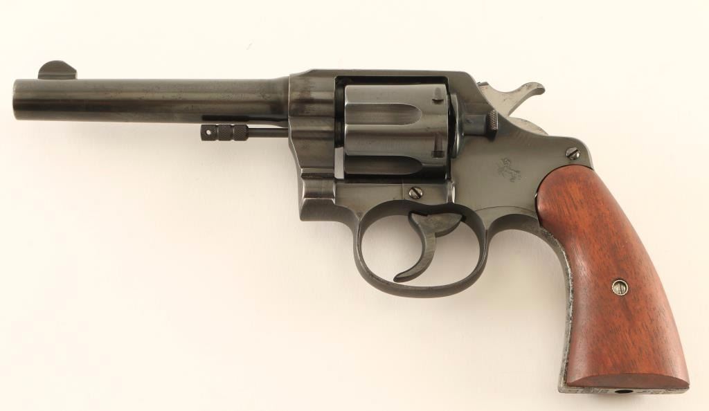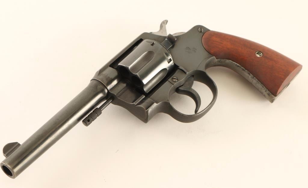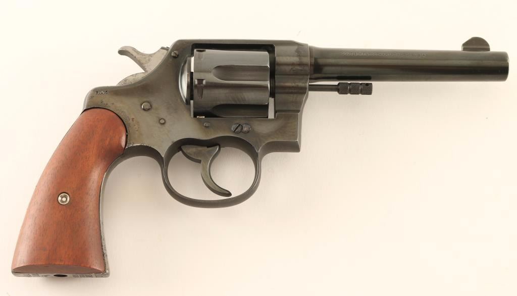 U.S. Army contacted large frame double-action revolver chambered in .45 Colt. circa 1911. Features a blued finish, 5.5" barrel, blade front sight, 'u' notched rear sight, non-shrouded ejector rod, fluted six-shot cylinder, smooth trigger, checkered hammer spur, removed lanyard ring and two-piece smooth walnut grips. Revolver exhibits approximately 80% of it's blued finish showing dark scattered pitting on the barrel, cleaned grip frame with dark pitting and an area of finish loss and pitting above the grip on the the right side of the frame. Action is crisp with solid lock-up, bore is excellent and wood grips are good+ as slightly shrunken. Condition is good. ***C&R Firearm*** ***Modern Firearm***