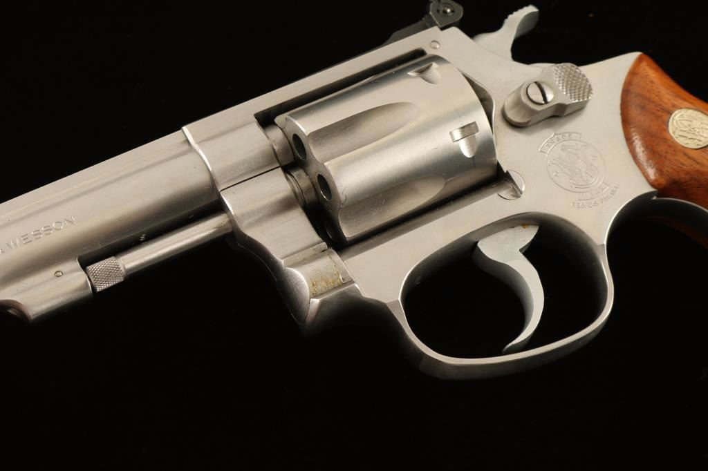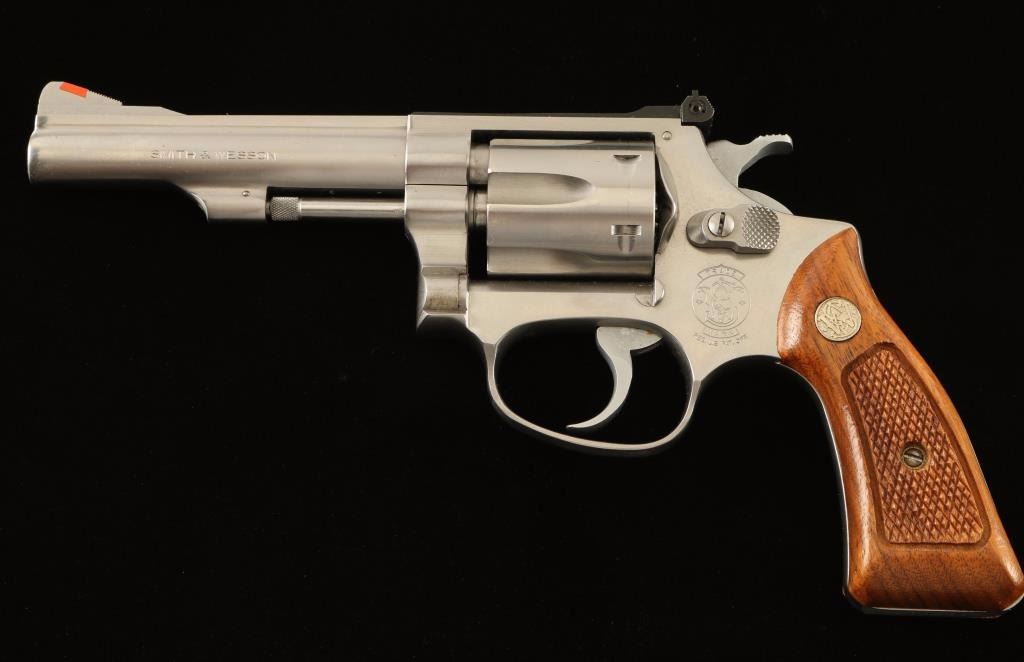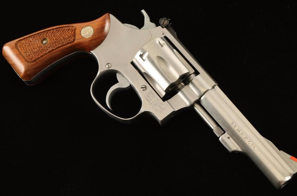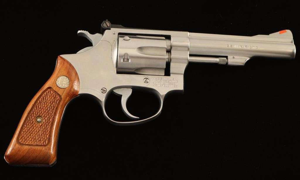 'Target Kit Gun' Small frame stainless steel double-action revolver chambered in .22 Winchester Magnum Rimfire, circa 1983-1988. Features a brushed finish, 4" barrel with serrated top rib, non-shrouded ejector rod, raised ramp front sight with orange insert, micrometer click adjustable rear window sight, fluted six-shot cylinder with recessed chambers, .312" smooth combat trigger, .375" semi-target hammer, round-butt J target frame and two-piece checkered walnut Magna grips with silver S&W medallions. Revolver exhibits light handling marks and a thin bright drag line on the cylinder with no major wear observed. Action is smooth with solid lock-up, bore is excellent and wood grips are near fine with minor imperfections. Condition is very good+++. ***Modern Firearm***