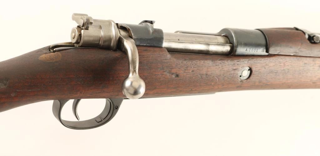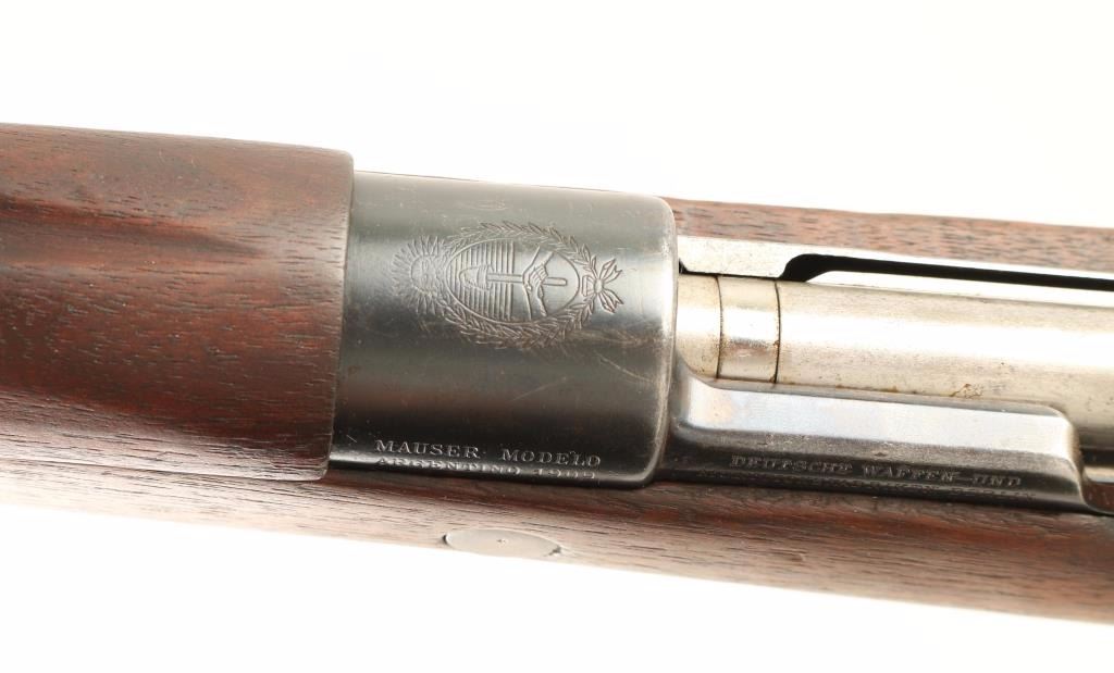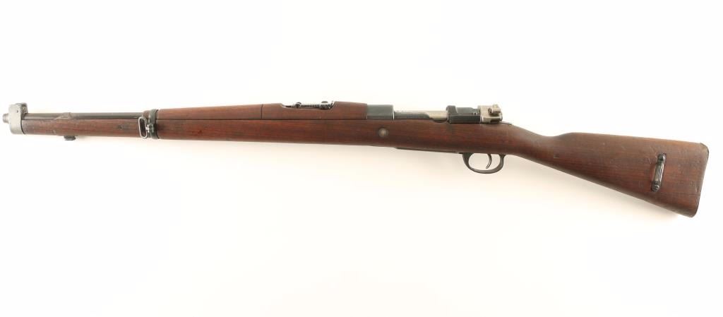 SN: A2001 Argentine military bolt-action service rifle chambered in 7.65x53mm, built in Berlin by DWM circa 1910-1911. Imported by JLD Enterprises of Farmington, CT with small import marks on the receiver. Features a blued finish, 22" barrel, shrouded & dovetailed inverted 'v' front sight, graduated rear sight to 1,400 meters, bayonet lug, bent bolt handle, manual safety on bolt, internal box magazine with hinged floorplate, smooth trigger, sling swivels, smooth wood handguard and full-length straight grip shoulder stock with smooth metal buttplate. Serial numbers match on the receiver, bolt handle and bottom metal. Rifle retains approximately 90% of it's finish intact overall showing light wear & handling marks. Action is smooth, bore is dull with semi-worn rifling and wood stocks are very good showing blemished, old repairs and a 1" hairline crack on the wrist extending from the top of the receiver. Condition is very good. ***C&R Firearm*** ***Modern Firearm***