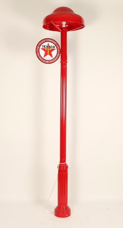 Reproduction all red pillar which has been electrified with a metal shade, connected is the 'Texaco Petroleum Products' logo. Includes electrical cord. Great addition to man cave or game room!