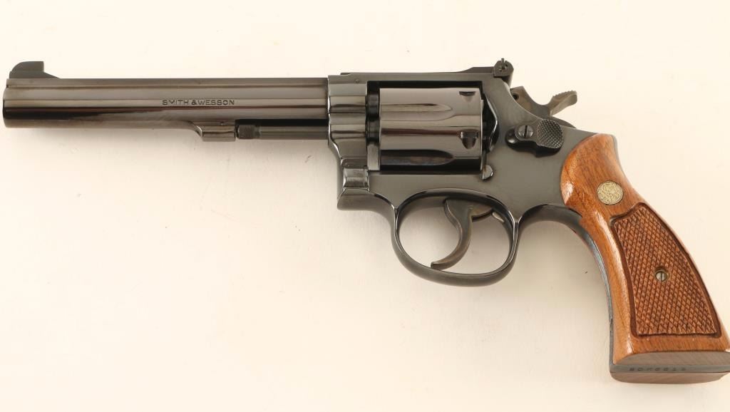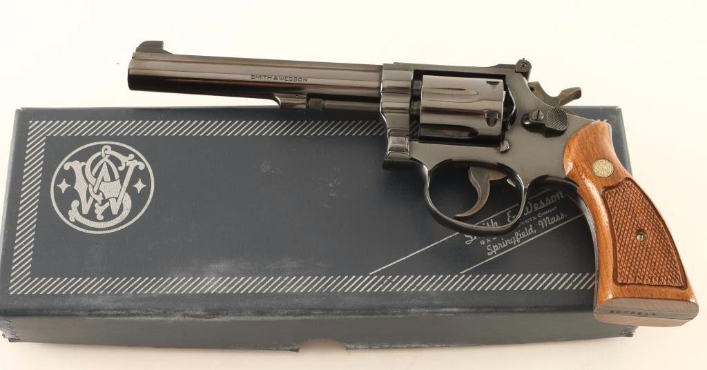 'K-38 Target Masterpiece' Medium frame double action revolver chambered in .38 Special, circa 1977-1982. Features a polish blued finish. pinned 6" barrel with solid rib, raised patridge front sight, micrometer click adjustable rear window sight, non-shrouded ejector rod, fluted six-shot cylinder, .265" serrated trigger, .375" semi-target hammer, square butt K target frame and two-piece checkered walnut Magna grips with silver S&W medallions. Includes the original factory cardboard box with documents. Revolver retains approximately 99% of it's original blued finish showing a faint drag line on the cylinder and minor handling marks. Action is is smooth with tight lock-up, bore is pristine and wood grips are very good++. Condition is near new in box. ***Modern Firearm***