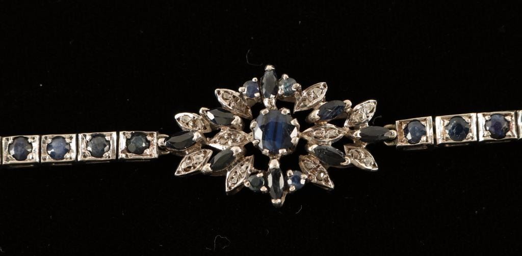 Center floral motif sparkles with sapphire and diamond petals set in white gold. Single strand of sapphires leads to a clasp with a safety clasp.
