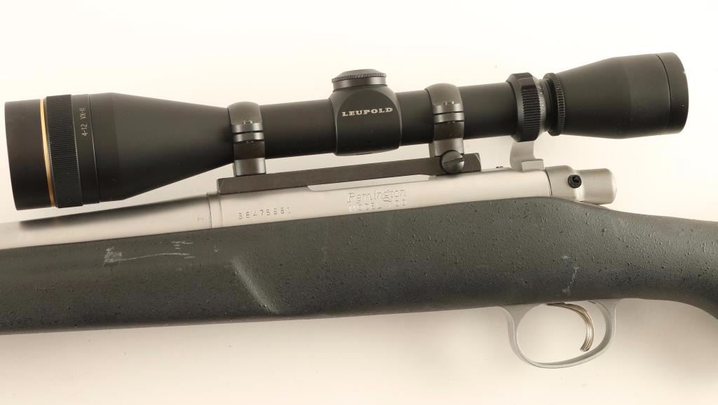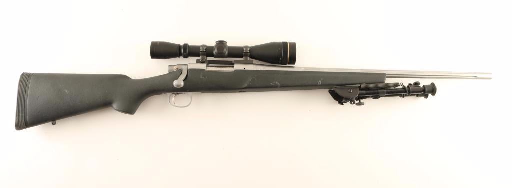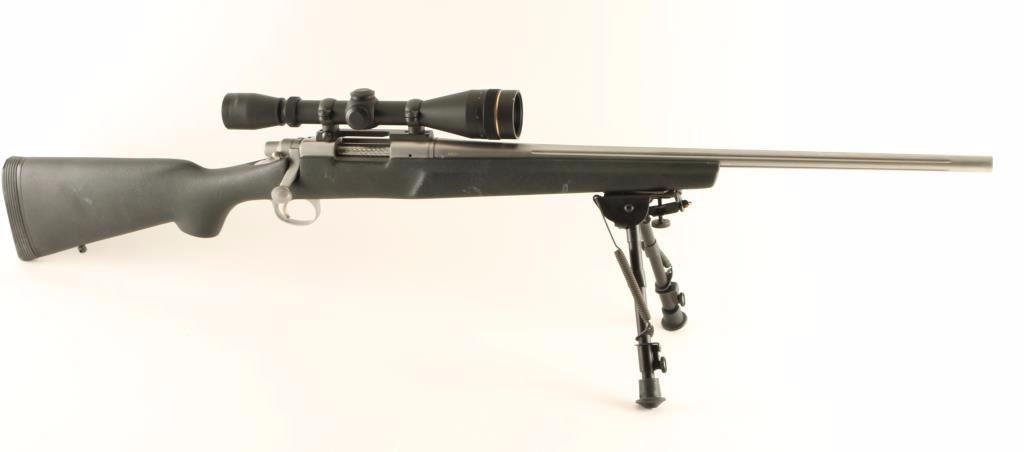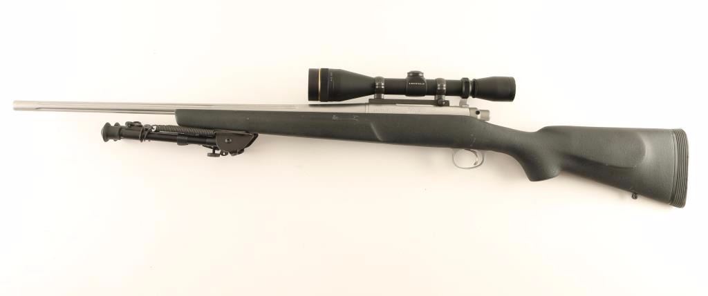'Light Varmint' High quality stainless steel bolt action sporting rifle chambered in .221 Remington Fireball. Features a glass bead matte finish, 22" fluted barrel with no provisions for sights, Leupold VX-II 4-12x scope, Harris Ultralight 9"-13" bipod, jeweled bolt, integral box magazine, adjustable serrated trigger, manual safety, internal locking safety on the bolt, swivel studs and textured black fiberglass pistol grip shoulder stock with pillar bedded action, semi-beavertail forend, right handed cheek rest & R3 recoil pad. Rifle exhibits a couple scratches & rubs, has a blemish on the underside of the barrel from being dropped and shows a few scattered dots of oxidation on the barrel near the muzzle. Action is very smooth, bore is pristine, optics are sharp and fiberglass stock is very good+ with a few scrapes & rubs. Condition is very good+++. ***Modern Firearm***