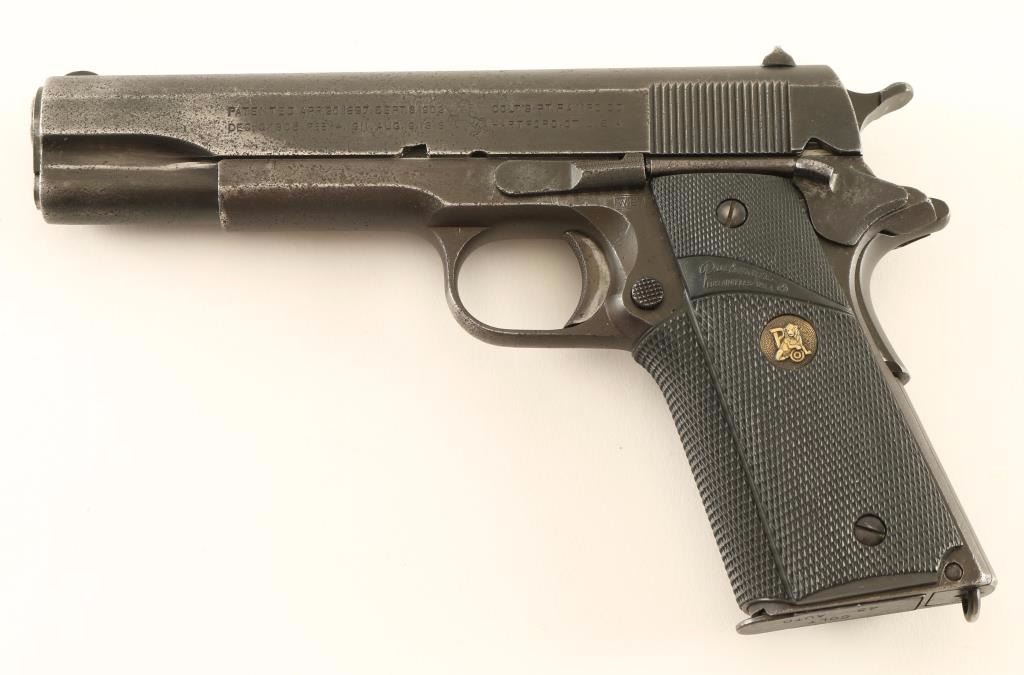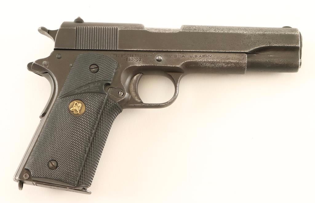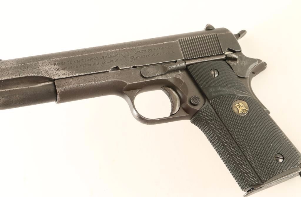 U.S. Military contracted semi-automatic service pistol chambered in .45 Automatic, circa 1943. Features a parkerized finish , 5" barrel marked "P" & "H", low-profile round blade front sight, dovetailed 'u' notched rear window sight, "UNITED STATES PROPERTY' marked frame with "W.B." inspector stamp, matching slide, checkered trigger, checkered wide hammer spur, thumb safety, beavertail grip safety, push button magazine release, Colt marked 7 round magazine, smooth flat mainspring housing with lanyard loop, and one-piece Pachmayr Signature checkered black rubber wrap-around grip. Pistol retains approximately 40% of it's parkerized finish with scattered pin-prick pitting throughout. Action is smooth, bore is good, and rubber grips are very good. Condition is fair. ***C&R Firearm*** ***Modern Firearm***