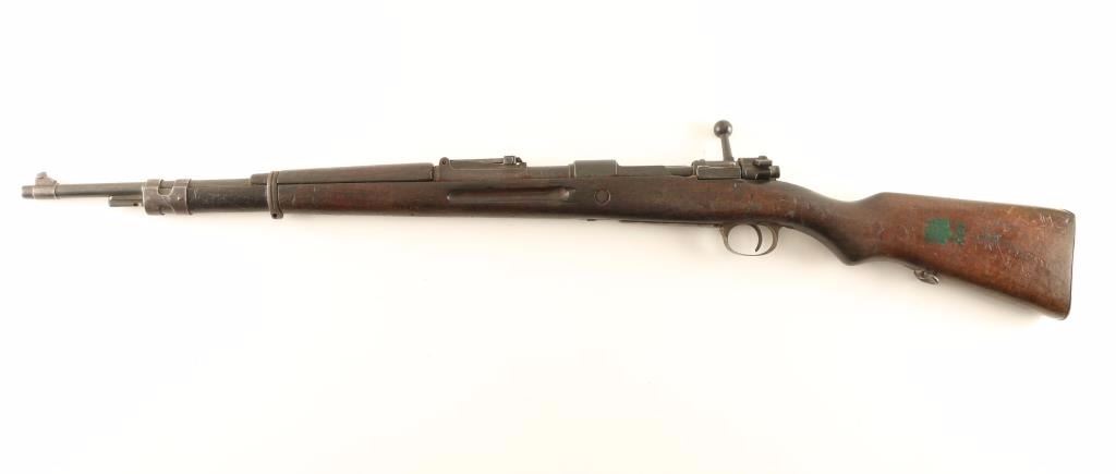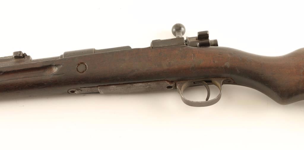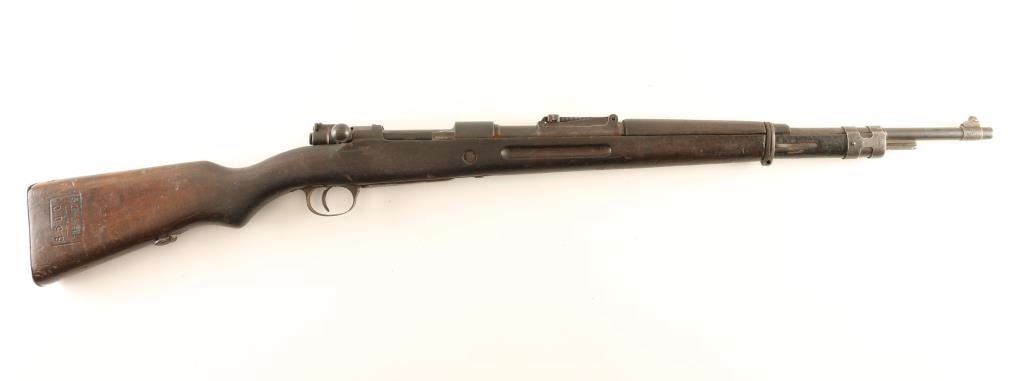 'Zhong Zheng Shi' Chinese military bolt action service rifle chambered in 7.92x57mm Mauser, built at the Nanjing Arsenal circa 1948.Features a blued finish, 24" barrel, dovetailed inverted 'v' front sight, tangent rear sight graduated sight to 2,000 meters, bayonet lug, straight bolt handle, manual safety, internal box magazine, smooth hardwood handguard and pistol grip shoulder stock with large military stamp & metal buttplate. Matching serial numbers on the receiver, barrel, floorplate, and bottom metal. Rifle exhibits an even dark grey patina with heavy rust along the stock line. Action is smooth, bore is dark with worn rifling and wood stocks are fair to good with cracks on the top & bottom of the wrist. Condition is fair. ***C&R Firearm*** ***Modern Firearm***