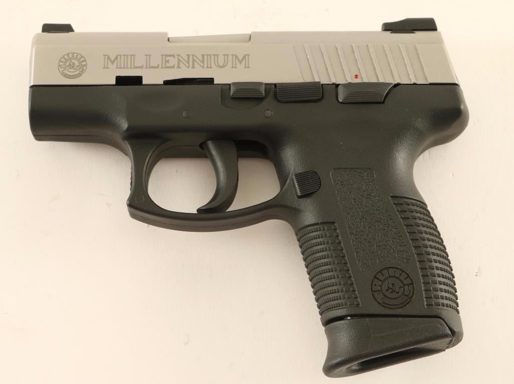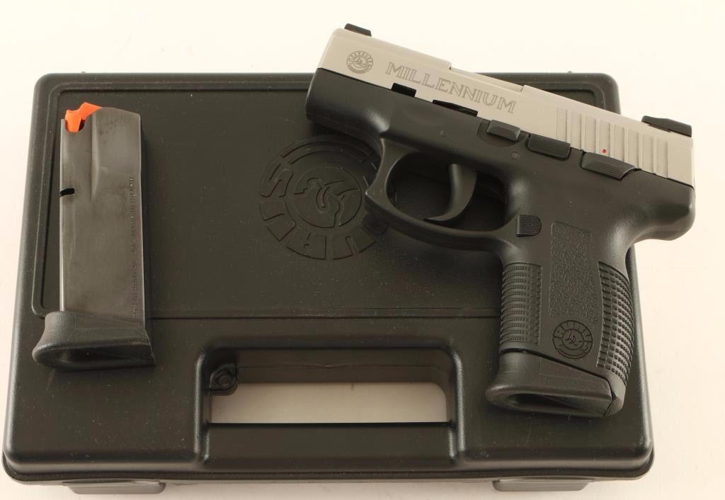 'Millennium' Brazilian made striker fired semi-automatic compact pistol chambered in .40 Smith & Wesson. Features a stainless steel slide with internal key lock, 3.25" barrel, Heinie high-contrast white dot sights, smooth polymer trigger, push button magazine release, 10 round factory magazine, thumb safety and black polymer frame with textured grip. Includes the original factory hard case with manual, cleaning brush, keys and spare magazine. Pistol exhibits little to no visible wear. Action is strong, bore is excellent and polymer is fine. Condition is like new in box. ***Modern Firearm***