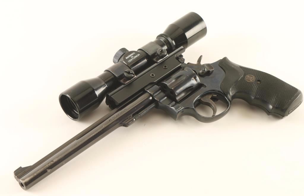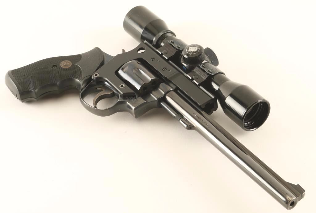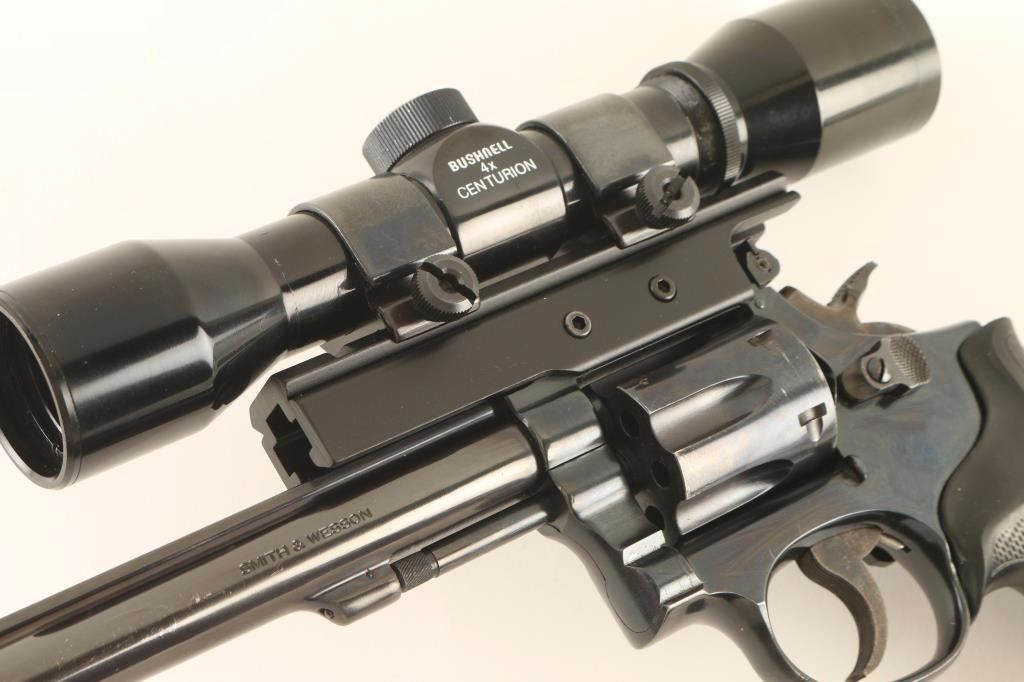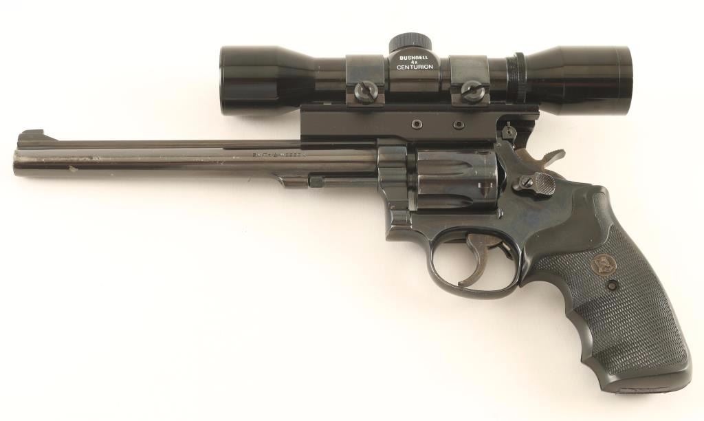 'K-22 Masterpiece Magnum' Medium frame double-action revolver chambered in .22 Winchester Magnum Rimfire, circa 1982-1986. Features a blued finish, 8 3/8" barrel with serrated top rib, ramped patridge front sight, adjustable micrometer click rear window sight(sight leaf is broken), Bushnell Centurion 4x E.E.R. scope on a large side-mounted see-through base, fluted six-shot cylinder with recessed chambers, non-shrouded ejector rod, .265" serrated service trigger, .375" semi-target hammer, square butt K target frame with ten groove grip straps, and one-piece Pachmayr Gripper checkered black rubber wrap-around finger groove grip. Revolver exhibits approximately 88% of it's original blued finish showing moderate/heavy holster wear, scattered pin-prick pitting/losses and a couple spot of dark rust rust on the trigger guard. Action is tight with solid lock-up, bore is excellent, and rubber grips are fine. Condition is good to very good. ***Modern Firearm**