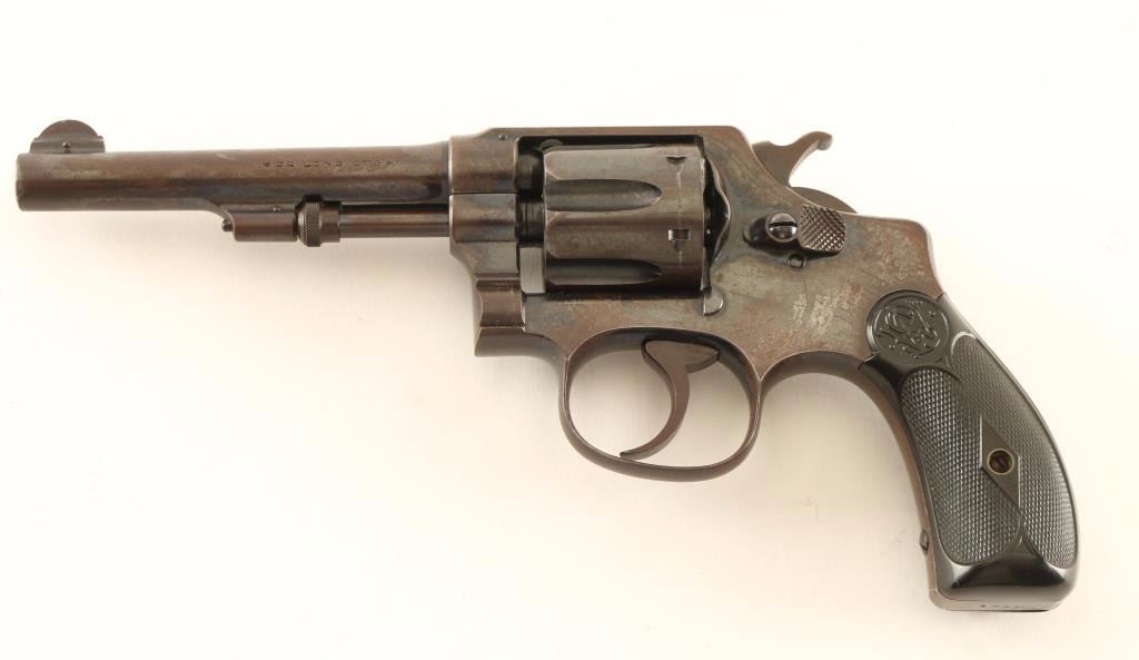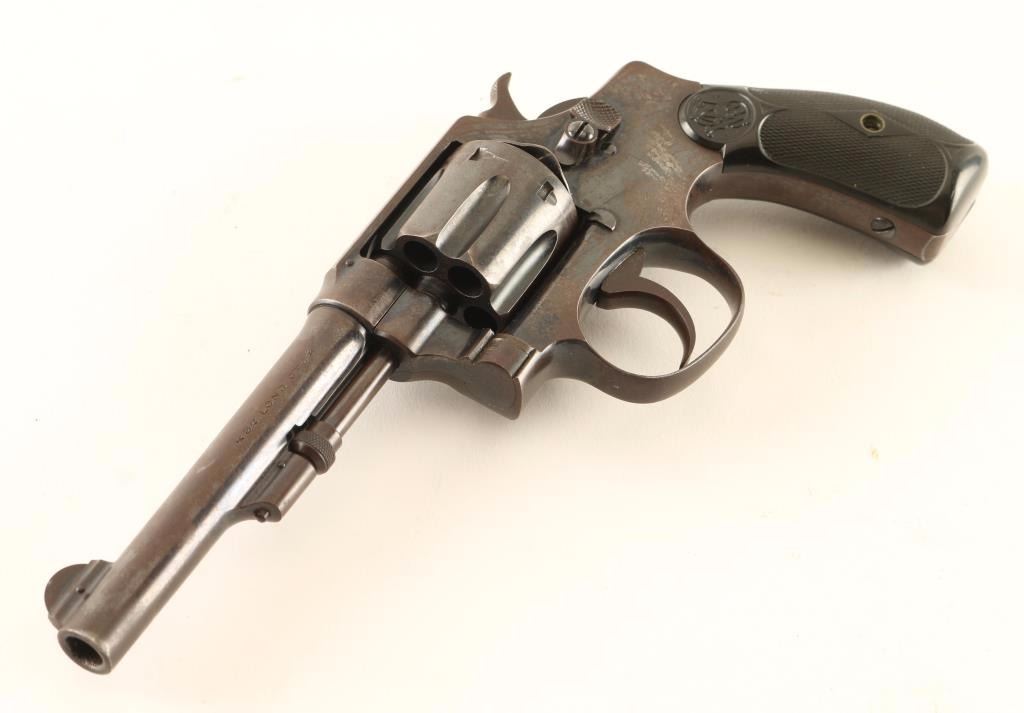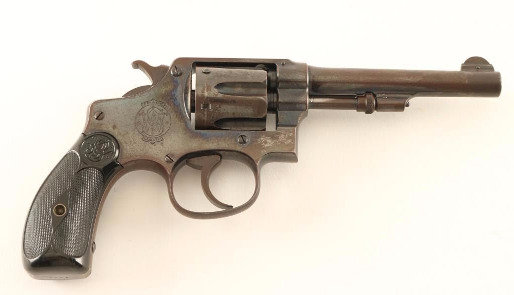 SN: 1149 'Model of 1903 2nd Model' Vintage small frame double-action revolver chambered in .32 Smith & Wesson Long, circa 1903-1904. Features a blued finish, pinned 4 1/4" barrel with forged sight base, pinned round blade front sight, 'u' notched rear sight, non-shrouded ejector rod, fluted six-shot cylinder, .240" smooth trigger, .240" service hammer, round butt I frame and two-piece diamond checkered black hard rubber grips with S&W insignias. Revolver exhibits approximately 20% of it's original blued finish showing heavy wear and some pin prick pitting on the left side of the frame with the balance of the metal surfaces turned to a brown patina. Action is sound with solid lock-up, bore is bright with good rifling & couple spots of scattered rust and hard rubber grips are very good+ with semi-worn checkering. Condition is good+. ***C&R Firearm*** ***Modern Firearm***