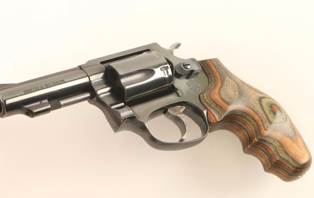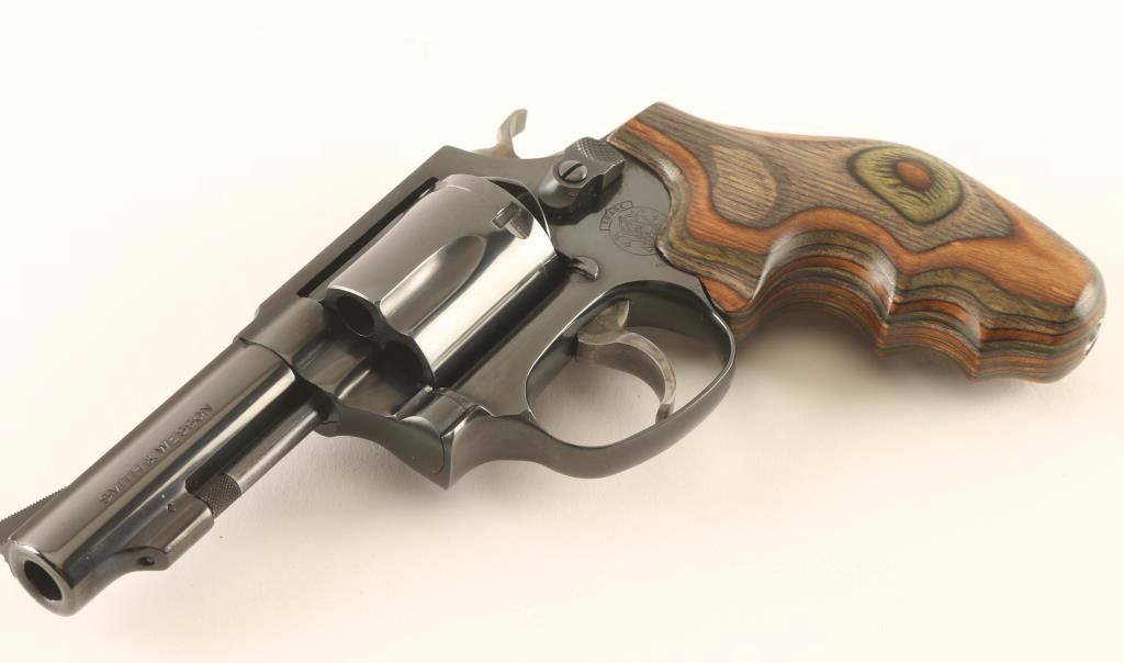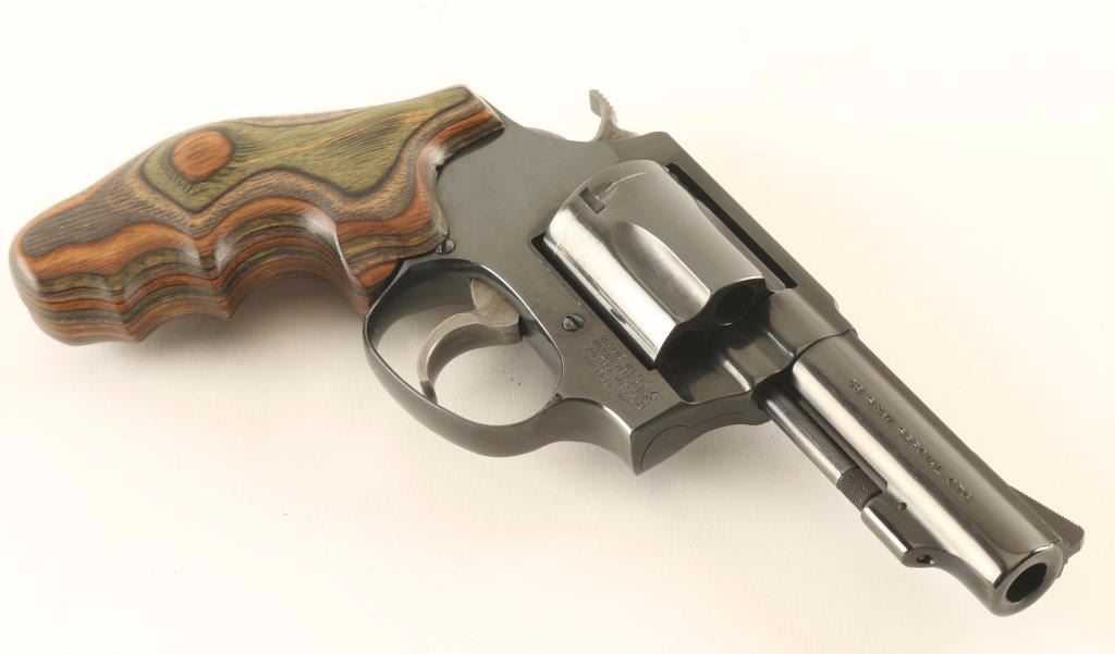 'Chiefs Special' Small frame double action revolver chambered in .38 Special, circa 1982-1988. Features a blued finish, 3" ribbed barrel, non-shrouded ejector rod, ramp front sight, square notched rear sight, fluted five-shot cylinder, .312" smooth combat trigger, .240" service hammer, round-butt J frame and one-piece green & brown laminated wood finger groove grip. Revolver exhibits approximately 97% of it's original blued finish showing a drag line on the cylinder, minimal wear and some minor blemishes. Action is smooth with tight lock-up, bore is pristine and wood grips are fine. Condition is excellent. ***Modern Firearm***