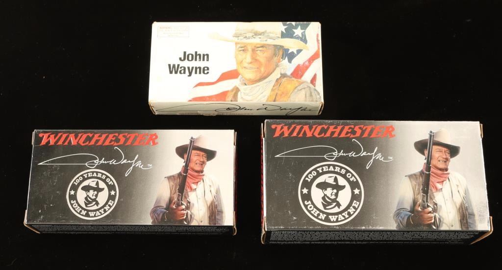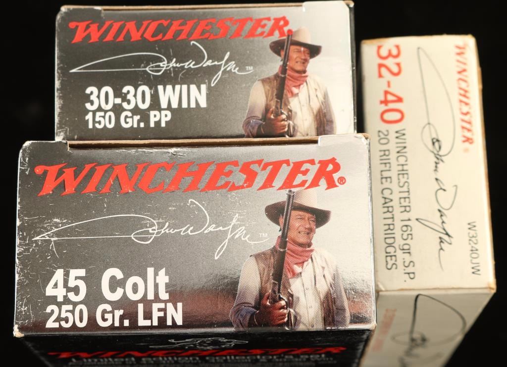 Three pristine boxes of John Wayne Collectors Ammunition which are unused in the original John Wayne 100 Years colorful box and every round has the "DUKE' brand on it: Including; Winchester 32-40 Cal, twenty rounds of the 165 grain SP, Winchester 30-30 Cal, twenty rounds of the 150 grain PP, Winchester 45 Long Colt Cal, fifty rounds of 250 grain LFN. Three pristine unused boxes of extremely hard to find Collectors Classic John Wayne Winchester Ammunition.