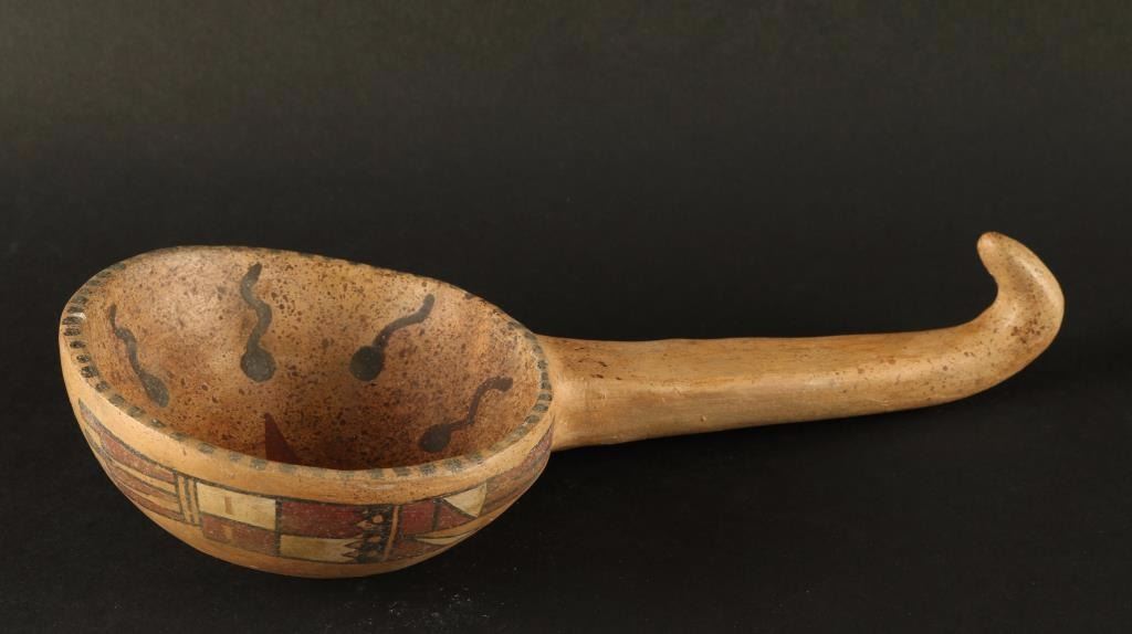 1375-1625 A.D. measures 9 1/2"x4 1/4" Polychrome ladle with tadpole design, has some repair. Includes certificate Allard Auctions