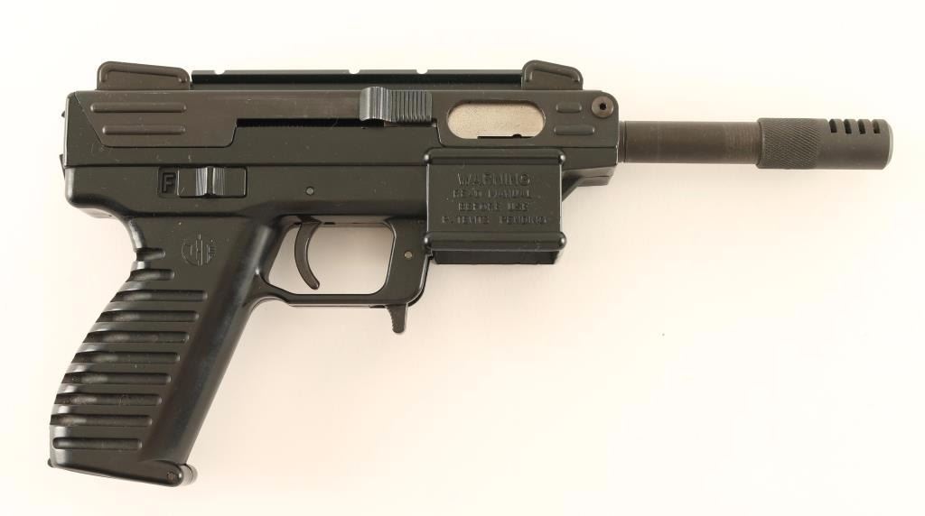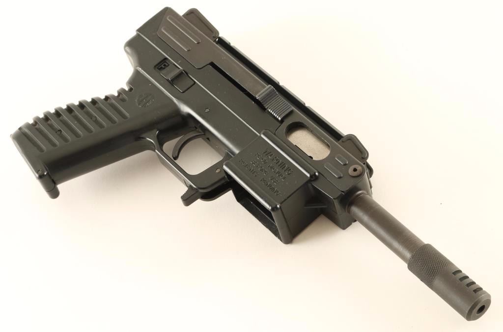'Scorpion' Blowback-operated semi automatic rimfire pistol chambered in .22 Long Rifle. Features a parkerized finish, 4" threaded barrel with compensator, shrouded post front sights, rear widow sight, installed scope rail, ambidextrous sliding safety & charging handle, no magazine and black polymer frame with integral grooved grip. Pistol exhibits approximately 95% of it's parkerized finish showing light overall wear and some light surface rust forming on the rear sight. Action is smooth, bore is very good+ and polymer is very good. Condition is very good. ***Modern Firearm***