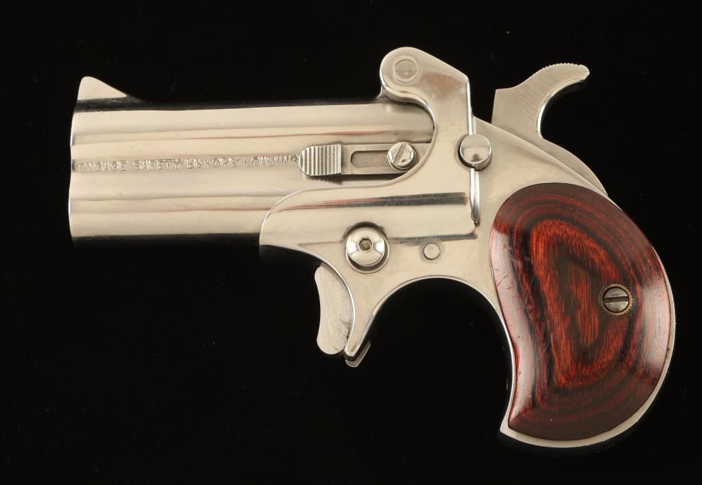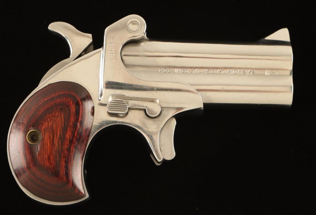SN: 48086 American made over/under double barrel derringer chambered for both .45 Colt and 2 1/2" .410 gauge shells. Features a nickel plated finish, 3" barrels, fixed blade front sight, 'u; notched rear sight, smooth spur trigger, push button safety, auto-rotating barrel selector in the hammer, manual ejector, and two-piece smooth laminated rosewood grips. Derringer retains approximately 99% of it's nickel plated finish which shows scattered superficial scratches throughout. Action is sound, bores are good, and wood grips are very good with some small imperfections. Condition is good+. ***Modern Firearm***