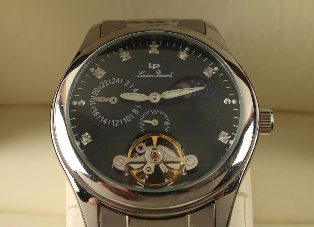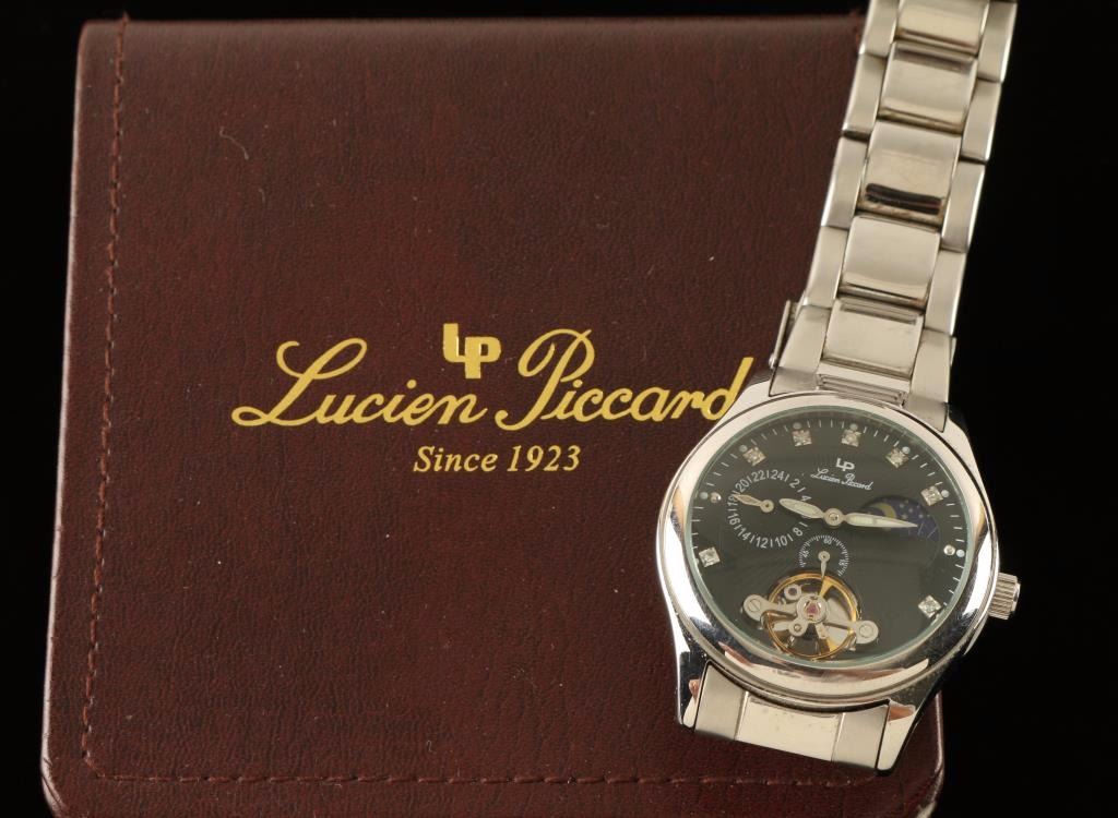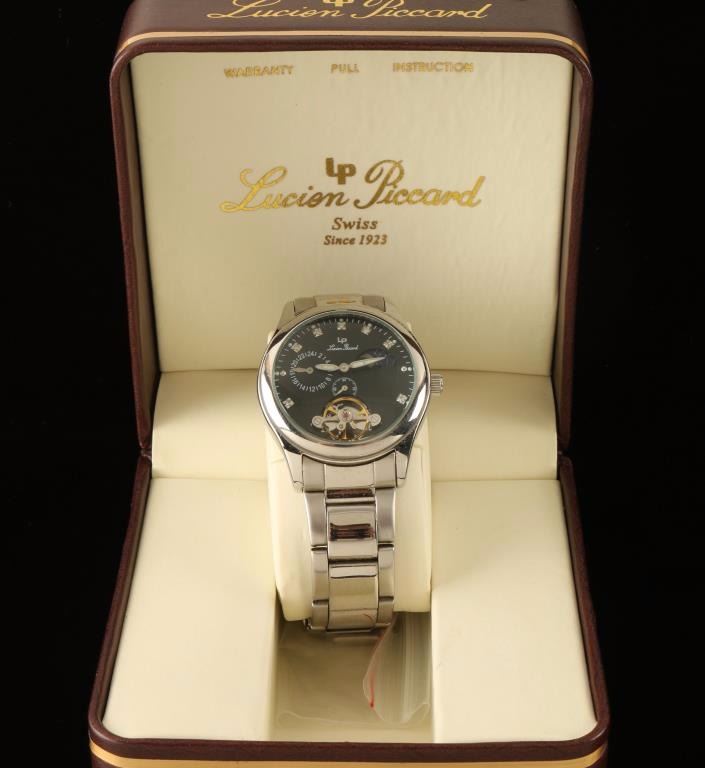 Lucien Piccard 26568BK with Swiss automatic movement. Stainless steel bezel adds to the overall looks of the watch. Case is engineered from stainless steel. It spans 1.38 inches across. Stylish color impact is advanced by the addition of the black color display. The watch is water resistant to 100 feet. High-tech mineral dial window. Attached by a double locking fold over clasp the band assures a top notch fit. In original box, good condition with extra links.