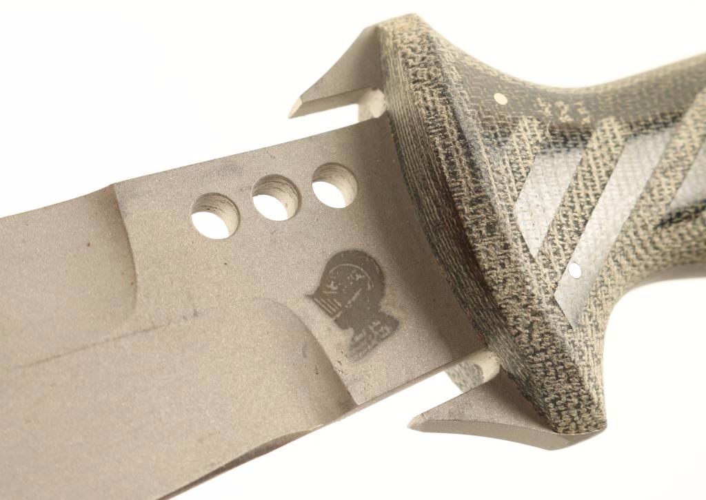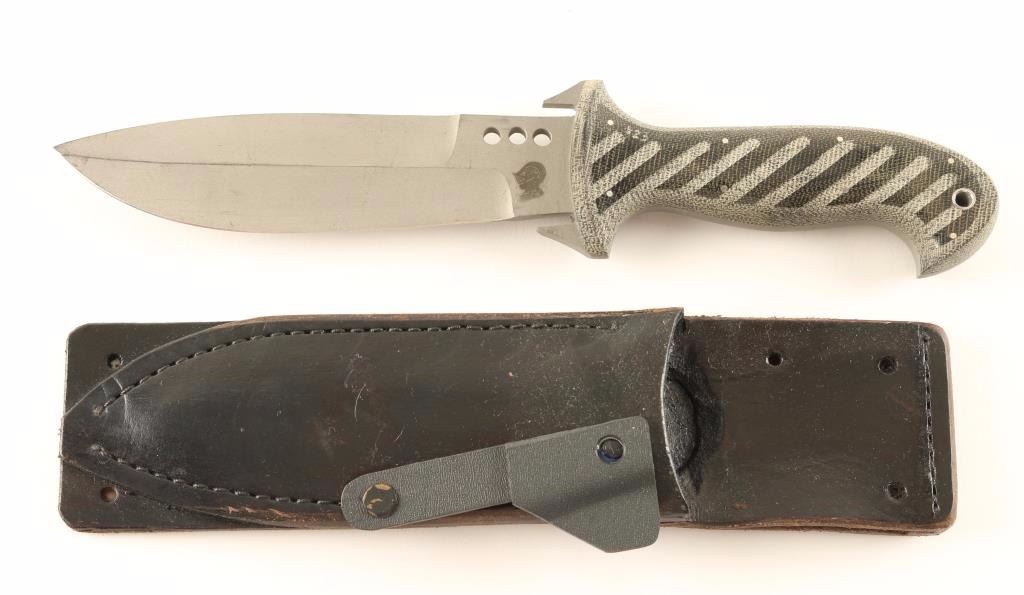 Gray and black composite handle with a #23, blade is gray coated stainless steel with a knight's head logo. Measures 10 3/4" overall with a 5 3/4" blade. Good condition. Comes in black leather sheath.