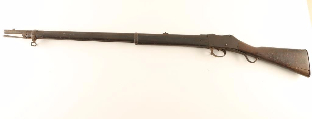 Antique British military martini-action single shot rifle chambered in .577/450, circa 1876. Features a 33.2" barrel, raised blade front sight, rear window sight, cleaning rod, bayonet lug, two barrel bands, serrated trigger, sling swivels, full-length smooth wood forend and straight grip shoulder stock with smooth metal buttplate. The metal surfaces have turned to a nice even dark patina with no remaining finish visible. Action performs well, bore appears bright, smooth & dirty and the wood stocks are fair. Condition is fair. ***Antique Firearm***