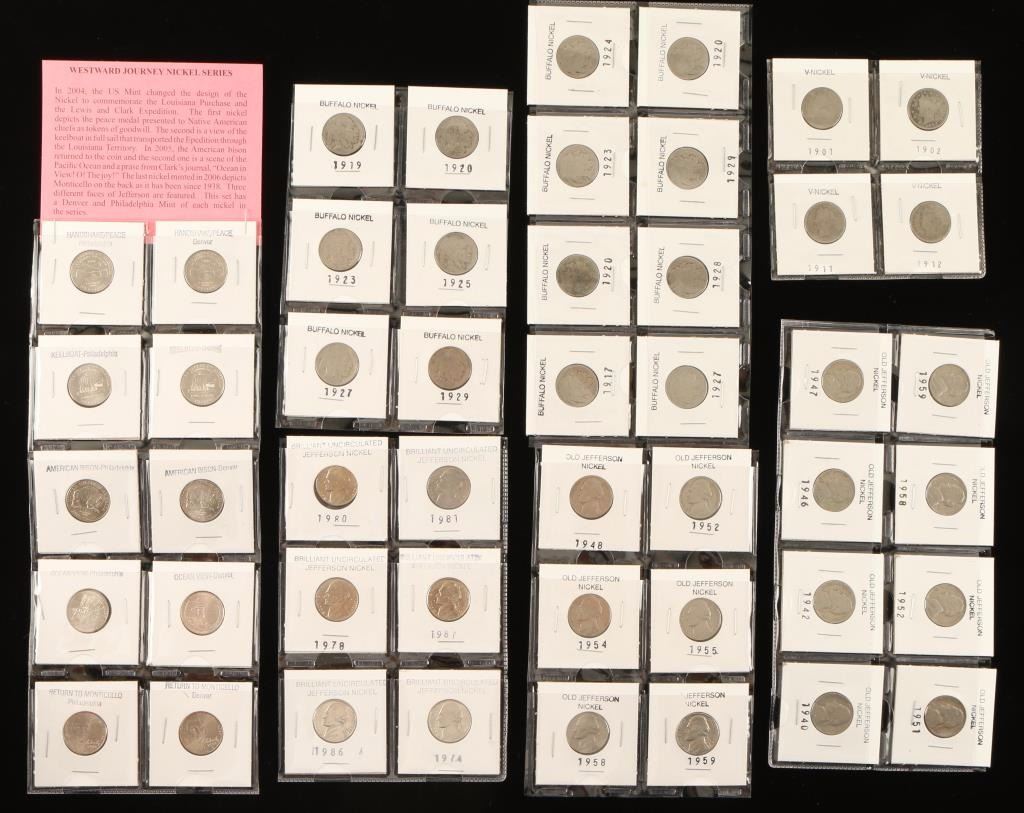 Including; 4 Victory Nickels from 1901-1912, 14 Buffalo Nickels from 1917-1929, 14 Old Jefferson Nickels from 1940-1959, 6 Brilliant Uncirculated Jefferson Nickels from 1974-1986, and a Westward Journey Nickel Series to commemorate the Louisiana Purchase and the Lewis & Clark Expedition-all dated 2004.