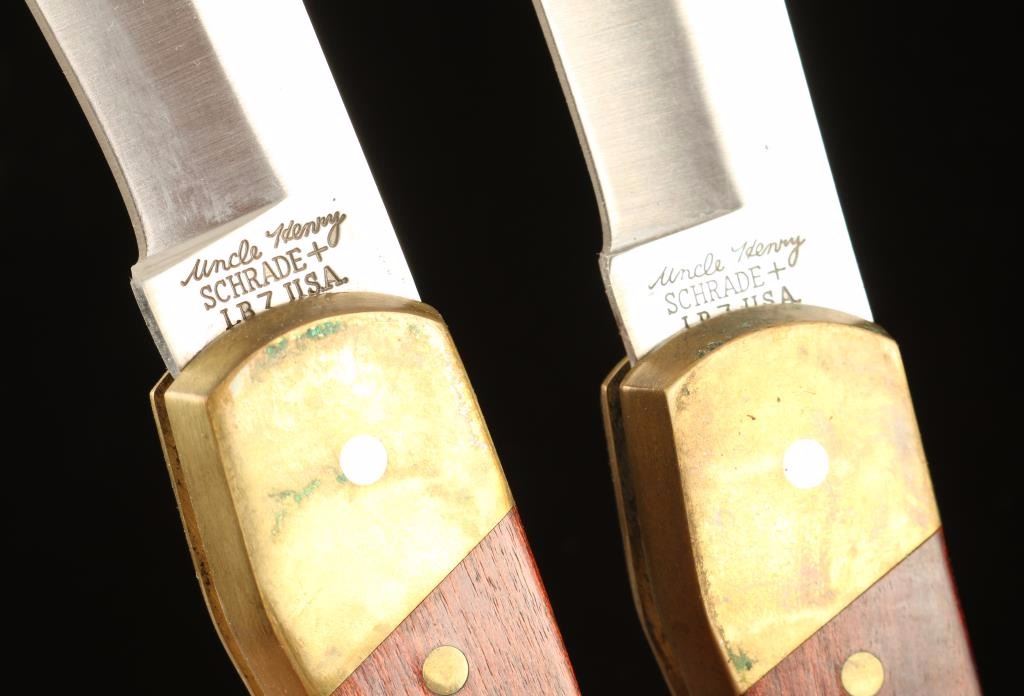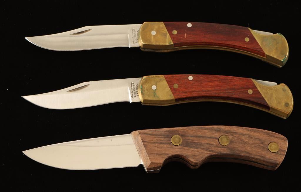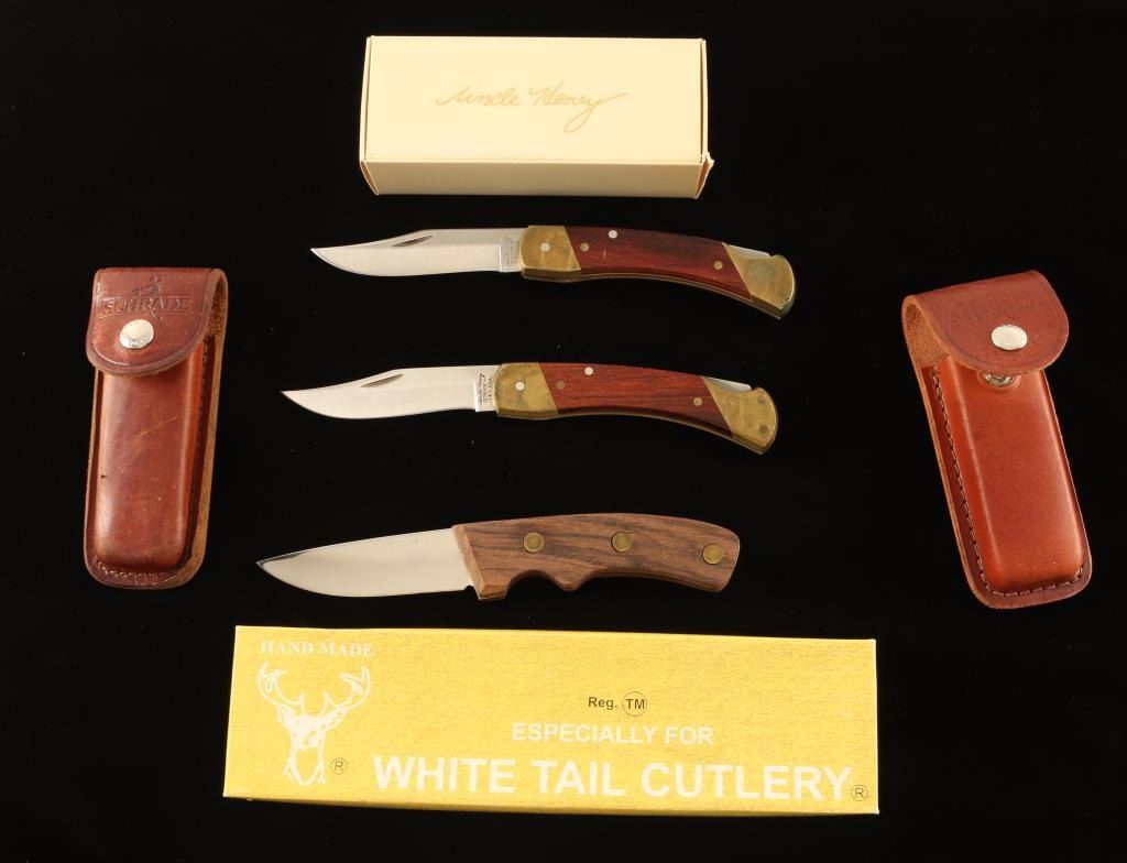 Including; Schrade pocket knife with wood handle and sheath, Uncle Henry Schrade pocket knife with sheath, and a White Tail Cutlery wood handled knife in original box.