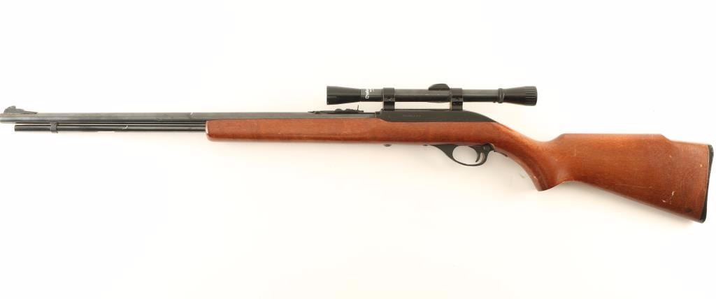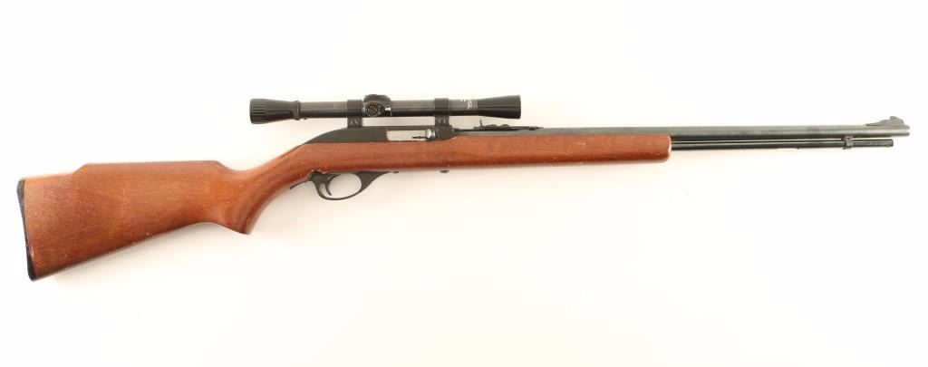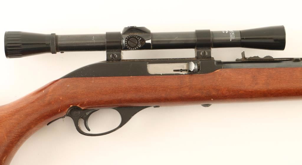 Tube-fed semi automatic sporting rifle chambered in .22 Long Rifle. Features a blued 22" barrel, full length magazine tube(missing magazine), ramped blade front sight, adjustable rear sporting sight, Weaver Challenger 4x scope, serrated trigger, push button safety, alloy receiver and a one-piece smooth wood pistol grip shoulder stock with high comb & checkered black plastic buttplate. Rifle exhibits approximately 88% of it's original finish showing light wear, handling marks and some adhesive residue on the barrel. Action functions well, bore is very good, optics are clear and wood stock is good to very good with numerous small blemishes. Condition good+. ***Modern Firearm***