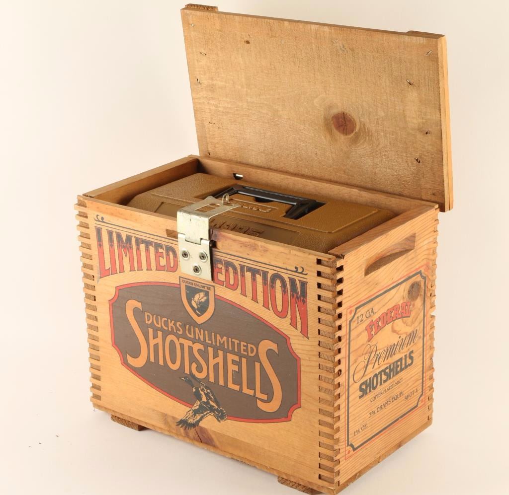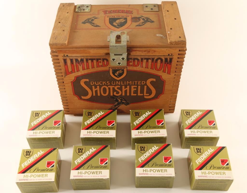 1/3600 in collector's series. Sturdy wood construction with brass hardware. Inside the box are two plastic ammo carriers inside embossed 'DU 1985' that contains four boxes of Federal Premium 12 Ga shotshells with copperplated shot. Box bears a special DU Limited Edition logo and every single shell is imprinted 'Ducks Unlimited 1984-85'. Measures 11 3/4"h x 14 1/4"w x 8"d. Great decor for man cave or cabin.