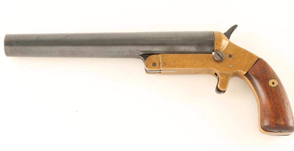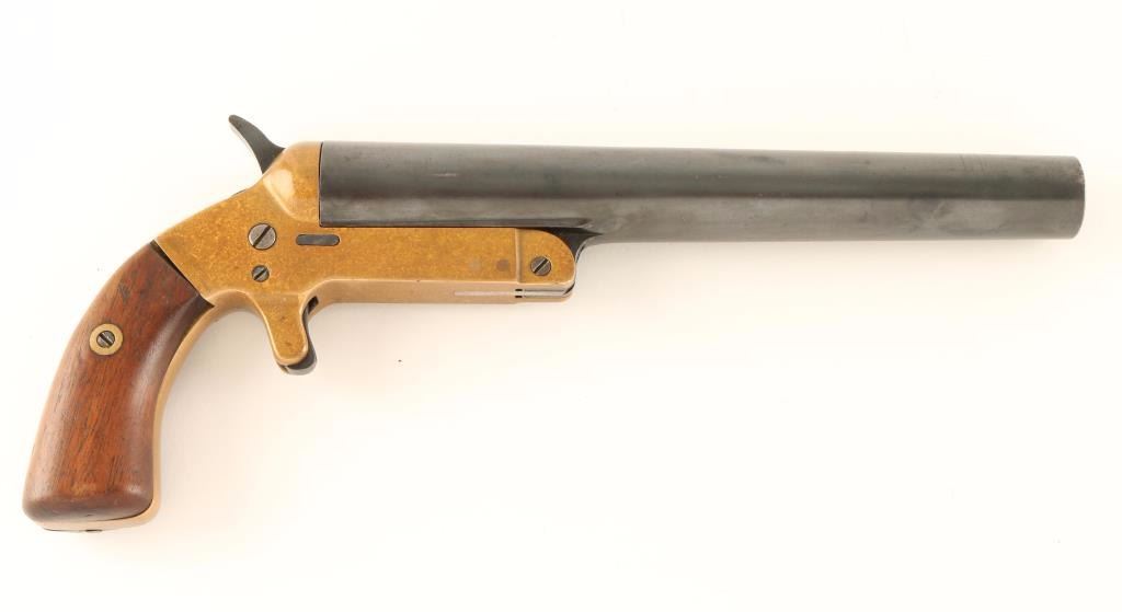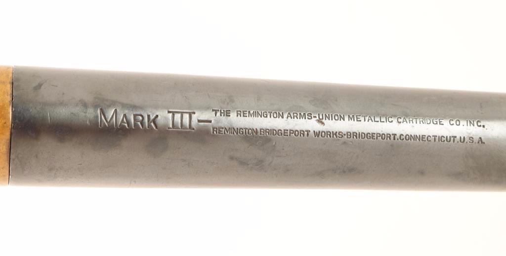 Brass and metal construction with wood grips. Marked 'Mark III, The Remington Arms Union Metallic Cartridge Co. Inc., Remington Bridgeport Works Bridgeport Connecticut U.S.A.'