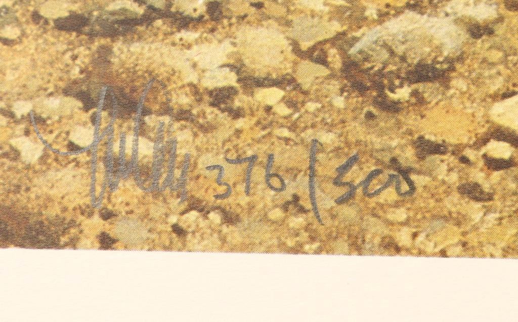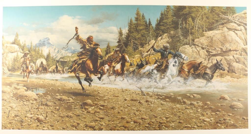 "The Last Crossing" 376/500 and signature in pencil lower left. Image measures 40"x20". Print only in Greenwich Workshop folio. Frank McCarthy was born in New York City and was drawn to the West since he read Will James novels as a boy. He was also intrigued by N.C. Wyeth illustrations. Frank McCarthy's formal training was at the Pratt Institute and had a career in commercial art and as an illustrator. The lure of the West was strong and he eventually settled in Sedona, AZ and became a member of the Cowboy Artists of America. Frank has had several shows in prominent museums and his work has appeared in many national magazines.