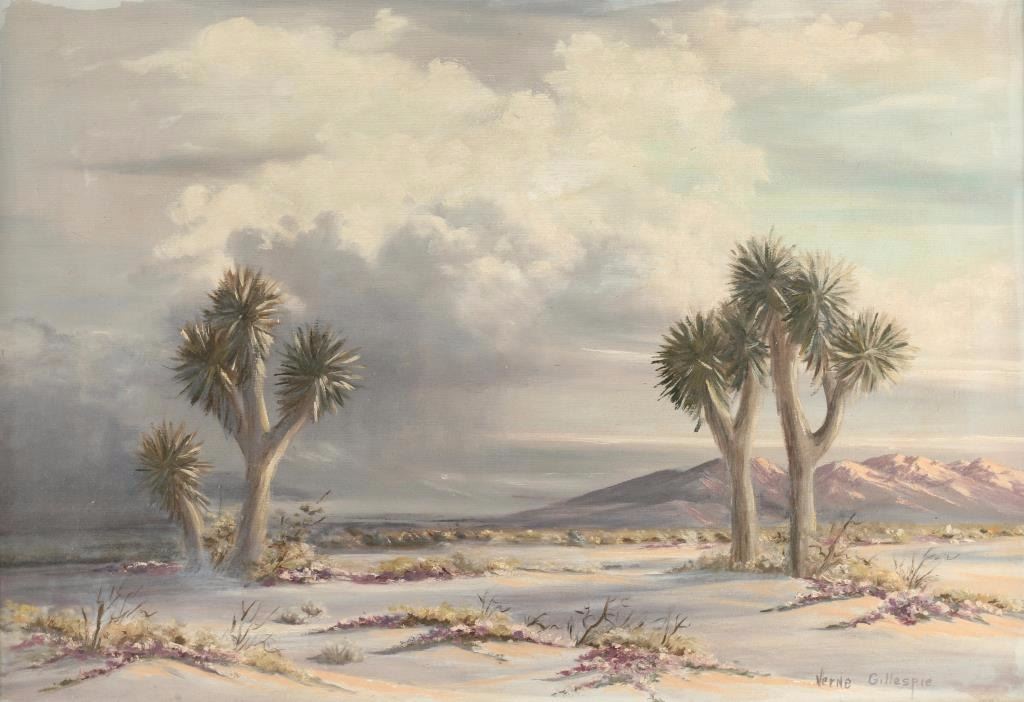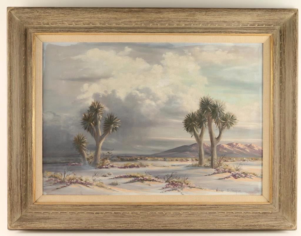 by Vern Gillespie depicting Joshua trees. Signed lower right, image size 23"x16 1/2" in rustic wood frame.