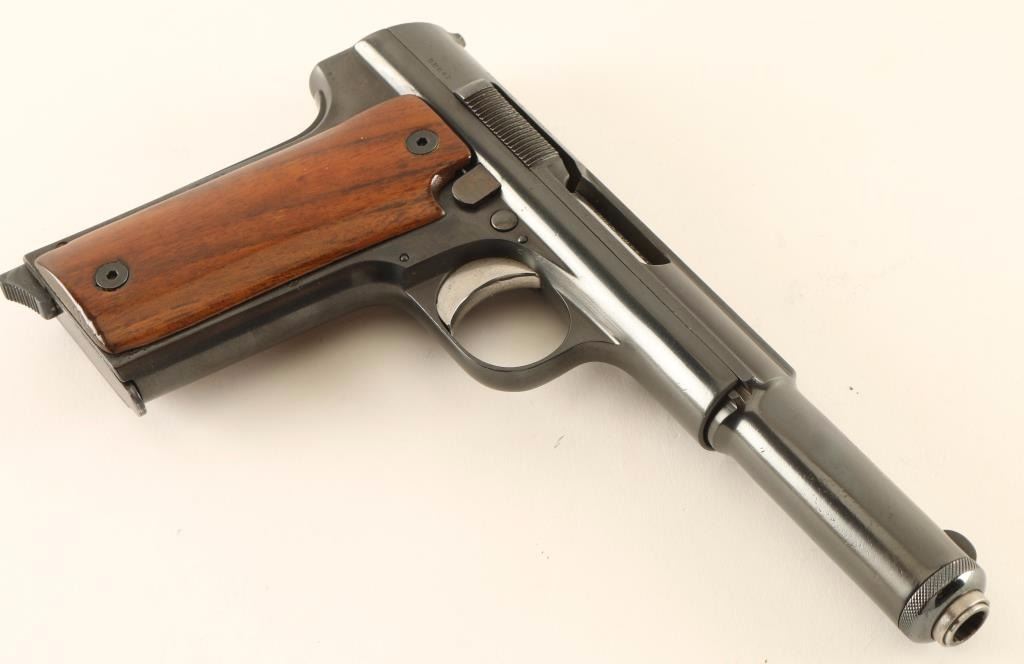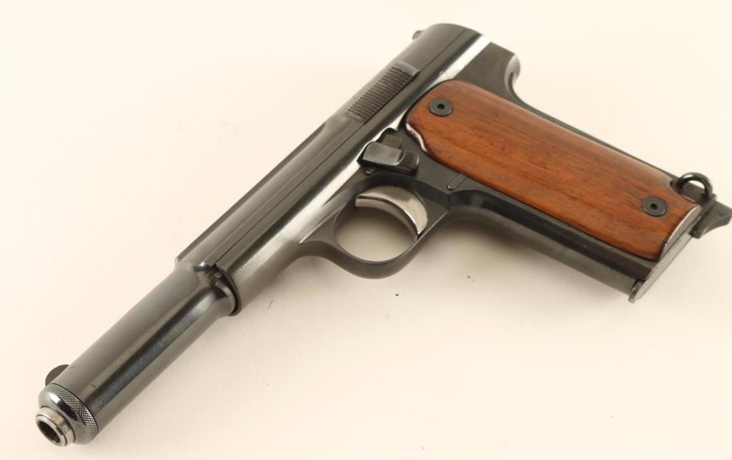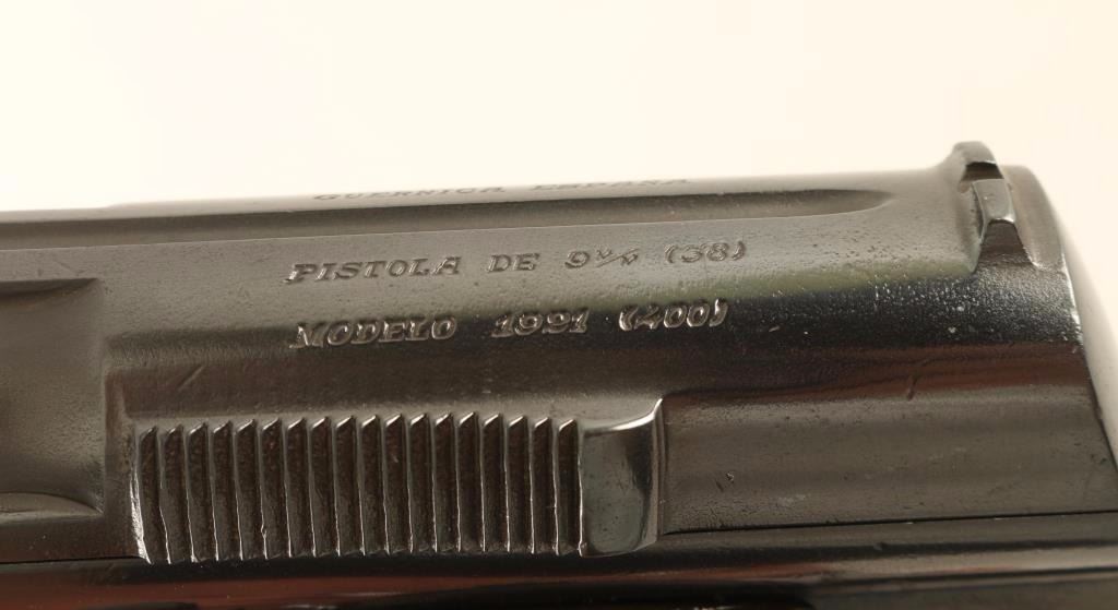 'Model 1921' Spanish military semi-automatic service pistol chambered in 9x23mm Largo, circa 1938-1939. Imported by I.A.C. of Alexandria, Virginia with import marks on the frame. Features a blued refinish, 6" barrel, blade front sight, notched rear window sight, bulged cocking serrations on the slide, steel frame, smooth trigger, thumb safety, grip safety, 8 round magazine, lanyard loop and two-piece smooth wood grips. Markings: Slide - "UNCETA Y COMPANIA//GUERNICA ESPANA", "PISTOLA DE 9M/M (38)/MODELO 1921 (400)". Astra crest "88847". Frame - "Spain", import marks & "88847". Barrel - "9m/m&38" & "88847". Pistol retains approximately 90% of it's blued refinish showing small scattered losses and old pitting under the finish on the barrel & slide. Missing the extractor assembly but otherwise appears to be in proper working order, bore is dull with scattered pin prick pitting & good rifling and wood grips are very good. Condition is good. ***C&R Firearm*** ***Modern Firearm***