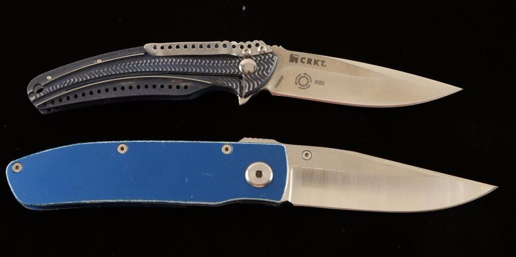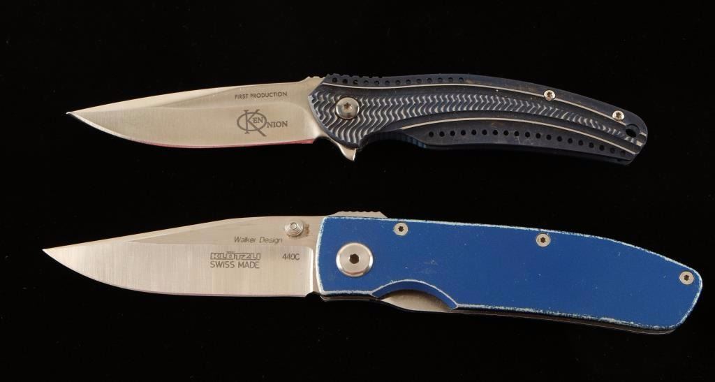 (1) Ken Onion of Kaneohe, Hawaii 1st production Ripple with a 2.78" stainless satin blade with a blue Titanium Nitride Coated 420J Stainless Steel handle. Marked 'First Production Ken Onion' and 'CRKT'. (1) KLOTZLI Walker Folder marked 'Walker Design, Klotzli Swiss Made' 440C titanium blade. in blue stainless steel case. Liner lock model with thumb stud for opening. Measures 4" closed with a 3" blade.