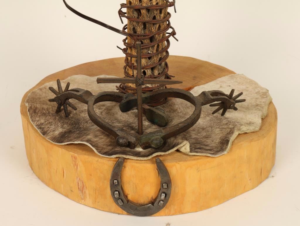 Round slice of log for base with hide, horseshoe and spur decoration. Lamp 'pole' is a cactus skeleton with barbed wire, concho, braided leather and fringe attached. Plain off white fabric shade. Working at time of description. Measures approx. 54"h x 14"dia. Great for the cabin or bunkhouse.