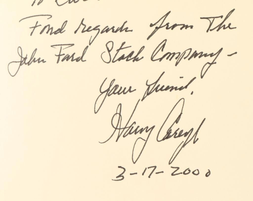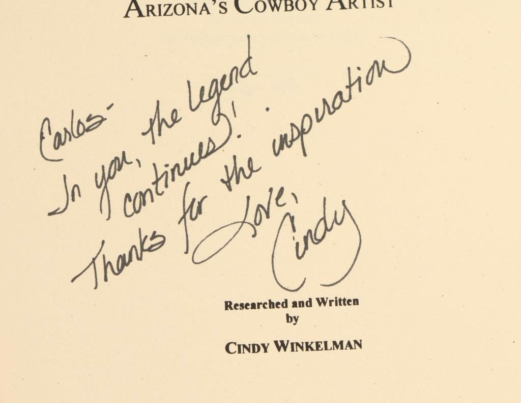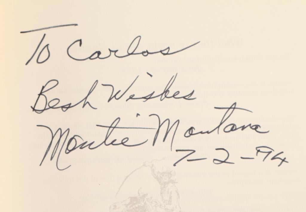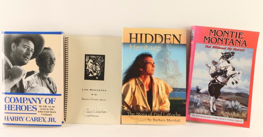 "Company of Heroes" by Harey Carey, Jr. signed by author, "Lon Megargee Arizona's Cowboy Artist" by Cindy Winkelman signed by author, "Hidden Heritage The Story of Paul LaRoche" by Barbara Marshak signed by Paul LaRoche, and "Montie Montana, Not Without My Horse!" autobiography signed by Montie Montana- book is coming apart.