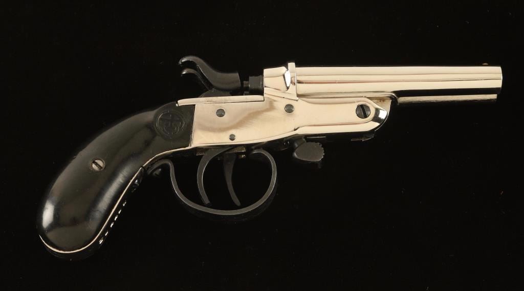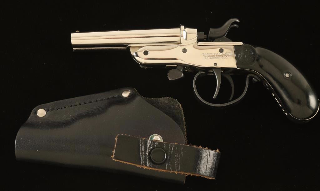 Brazilian made side-by-side double barrel pistol chambered in .22 Long Rifle. Features a nickel plated finish, 2.8" barrels, brass bead front sight, double triggers, exposed hammers and two-piece smooth black synthetic grips. Includes a small smooth black leather belt loop holster stamped "Big Cutlery/Japan." Pistol exhibits approximately 99% of it's nickel plated finish which shows light to moderate handling marks. Action is strong, bores are very good and synthetic grips are very good. Condition is very good+++. ***Modern Firearm***