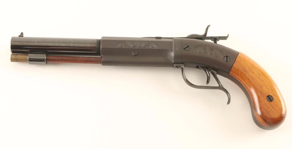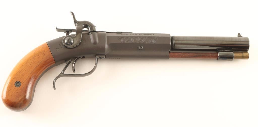 Modern production single action percussion pistol chambered for .45 caliber ammunition. Features a blued finish, 7" barrel, scroll engraved receiver, smooth trigger, finger rest trigger guard, checkered hammer spur, wood ram rod with brass tip and two-piece smooth wood grips. Pistol exhibits approximately 95% of it's original finish showing light scattered wear. Action functions well, bore is clear and wood grips are fine. Condition is very good+++. ***Antique Firearm***