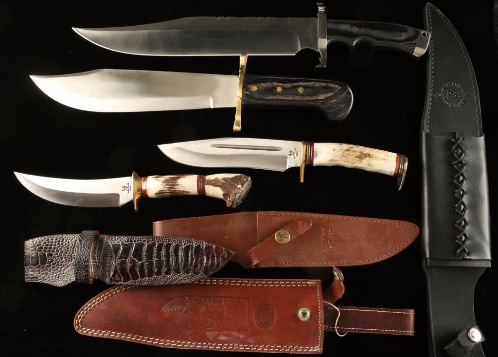 (1) White tail Cutlery with faux antler handle 12" overall with a 6"blade. (1)Chipaway Cutlery Bowie, wood handle, 16"overall with 9"Blade, brass guard and leather sheath (1) Croc Knife sheath (1)Magnum Bowie by Gill Hibben with sheath, 18 1/2" overall with 12"blade (1) White Tail Cutlery 11"overall with 6 " blade with sheath.