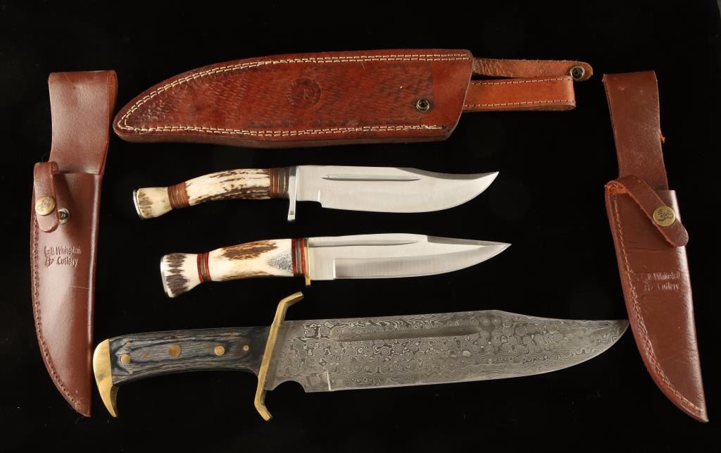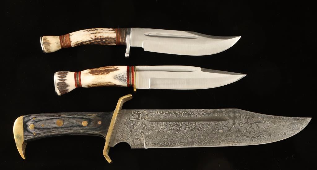 (1) Whitetail Cutlery with faux bone handle with green and red accents and brass guard. measures 11" overall with a 5 3/4" blade in brown leather sheath. (1) Whitetail Cutlery knife with a faux antler handle with nickel molded pommel and guard with red and green accents. Measures 11 3/4" overall with a 6" blade in a brown leather sheath.(1) Timber Rattler with a damascus steel blade, wood handle and brass guard and end. Measures 16 1/2" overall with a 9 1/2" blade in a brown embossed leather sheath.