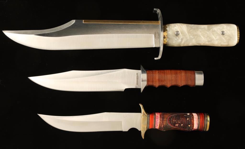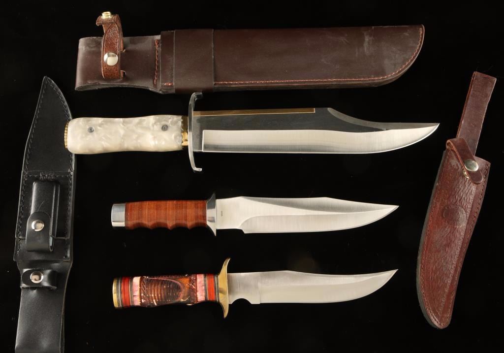 (1) Magnum by Boker survival knife with a stacked leather handle with 440A stainless steel blade. Measures 12 1/2" overall with a 7" blade with sheath and sharpening stone.(1) Bowie Knife with brass accents and faux mother of pearl handle. Measures 17" overall with an 11" blade with brown leather sheath. (1) Whitetail Cutlery 12" overall length with a stainless steel blade, brass guard, original stag handle and a leather sheath.