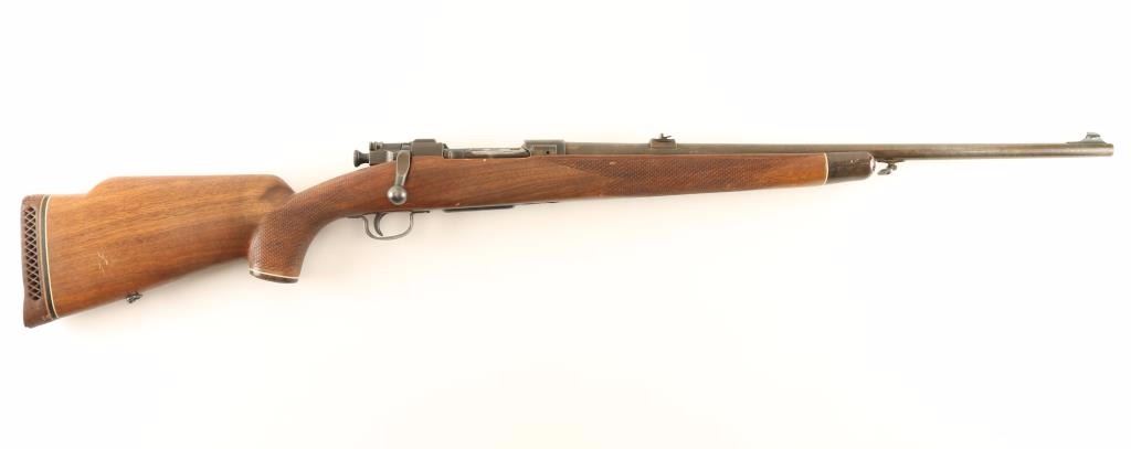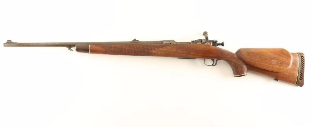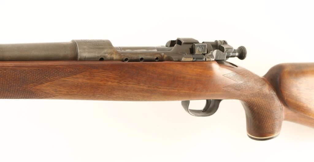 Sporterized U.S. Military contracted bolt-action service rifle chambered in .30-06 Springfield, circa 1942. Features a parkerized/blued finish, 24" barrel with European style swivel stud attached, ramped blade front sight, raised rear window sight with folding leaf, manual safety, 5-round integral box magazine, magazine cut-off, smooth trigger, modified bolt handle, stamped metal floorplate & trigger guard, drilled & tapped receiver for a side mounted sight and checkered Monte Carlo style wood stock with faux wood plastic grip cap, sling swivel & rubber recoil pad. Rifle retains approximately 15% of it's finish intact overall showing heavy wear and some cleaning. Action is smooth, bore is pristine, and wood stock is very good with semi-worn checkering and blemishes. Condition is near good. ***C&R Firearm*** ***Modern Firearm***