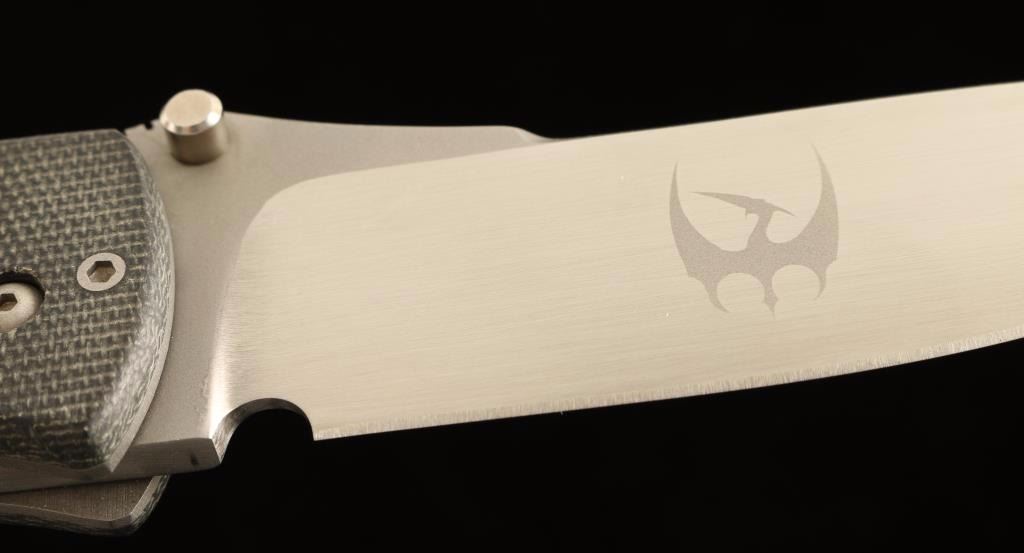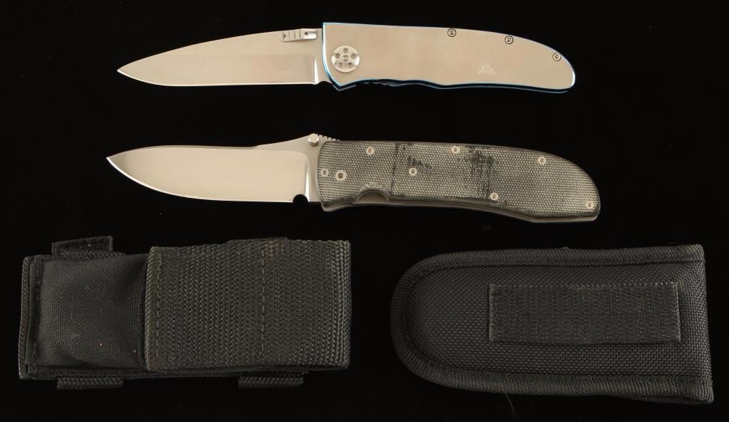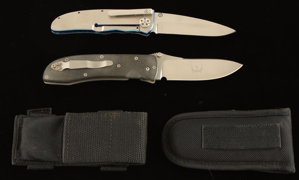 (1) Textured micarta handle with a satin silver plain edge blade. (1) All metal folder with plain edge blade. Both knives include sheath.