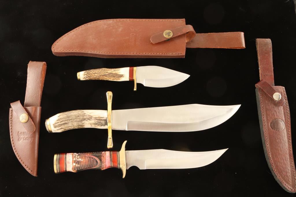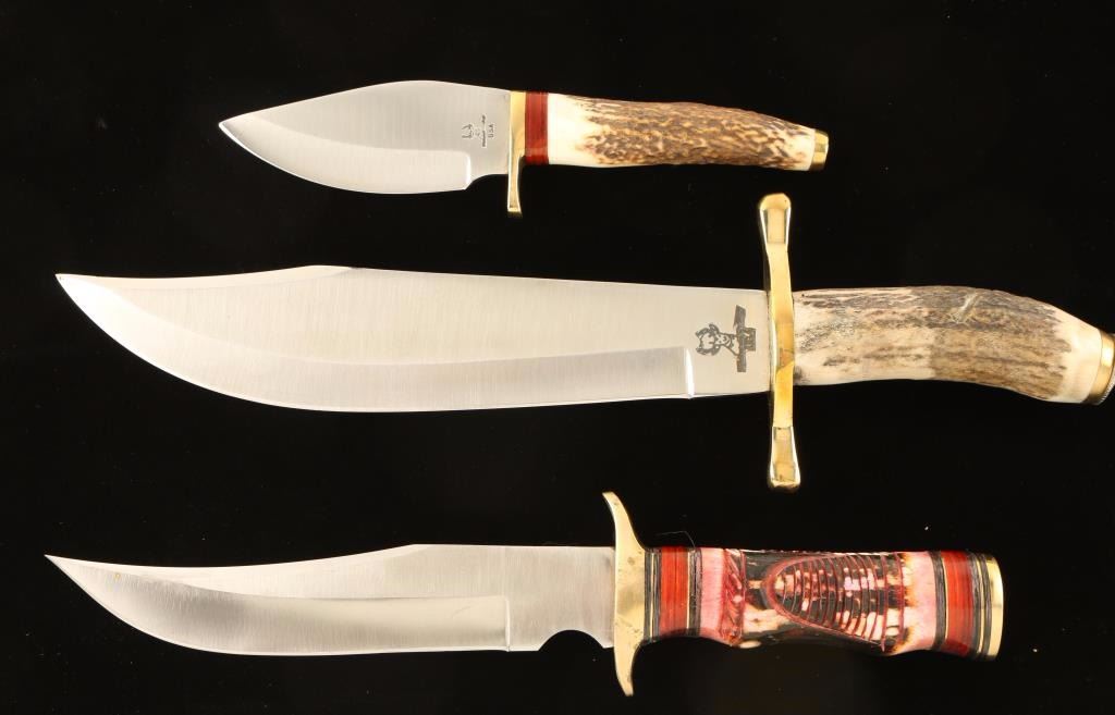 (1) Whitetail Cutlery 12" overall length with a stainless steel blade, brass guard, original stag handle and a leather sheath. (1) Whitetail Cutlery skinning knife measures 8 1/4" overall with a 6 1/2" blade. Stag handle with brass guard and end. Comes with leather sheath. (1) Whitetail Cutlery Bowie Knife measures 14" overall with a 8 1/2" stainless steel blade. Stag handle with brass guard and nickel and brass embellished end. Comes in brown leather sheath.