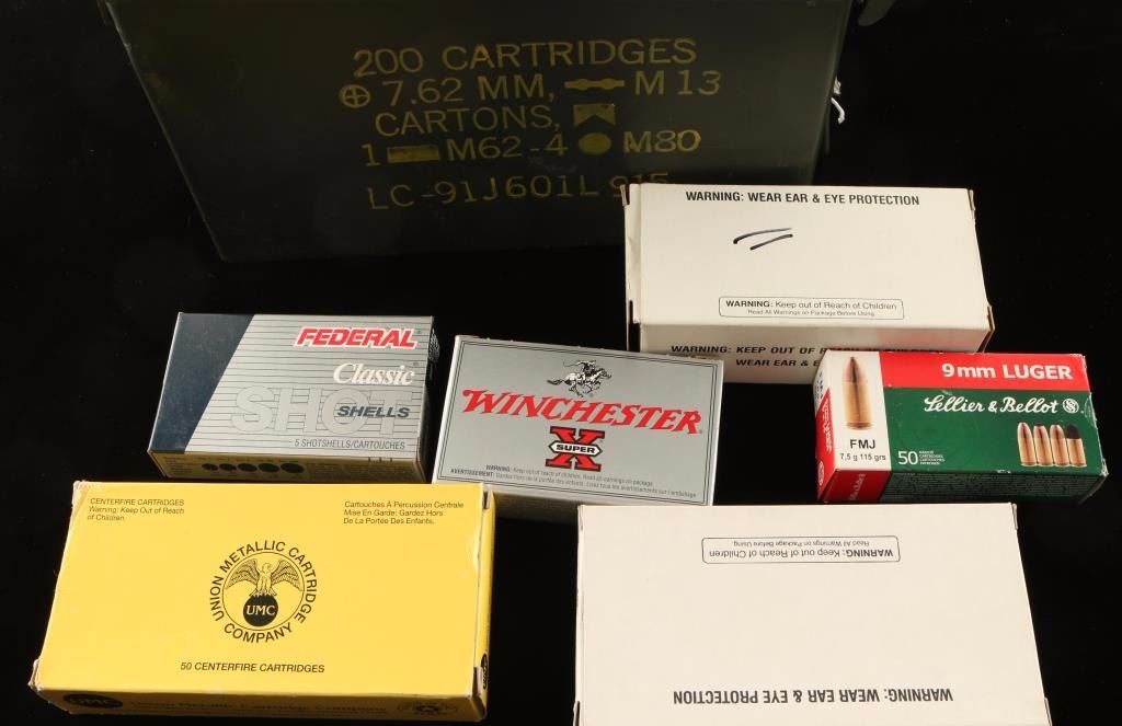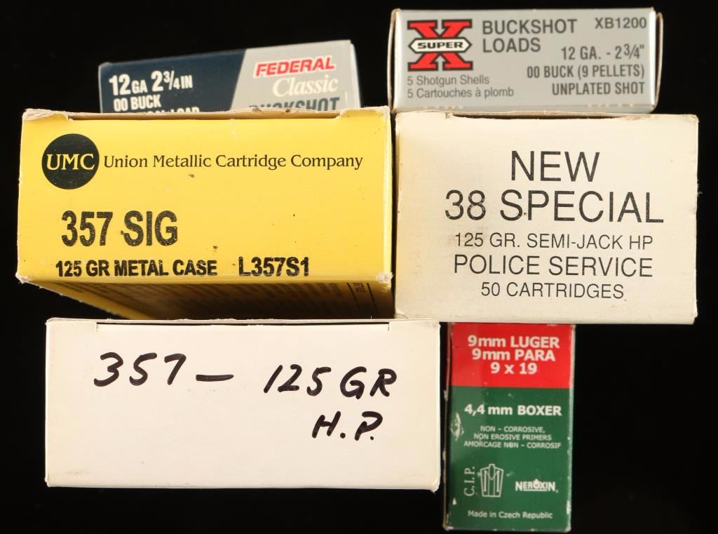 12 Ga., 9mm Luger, 50 Rds 38 Spl, 10 Rds 357 Sig, and a half box of 357 Sig-20 Rds.