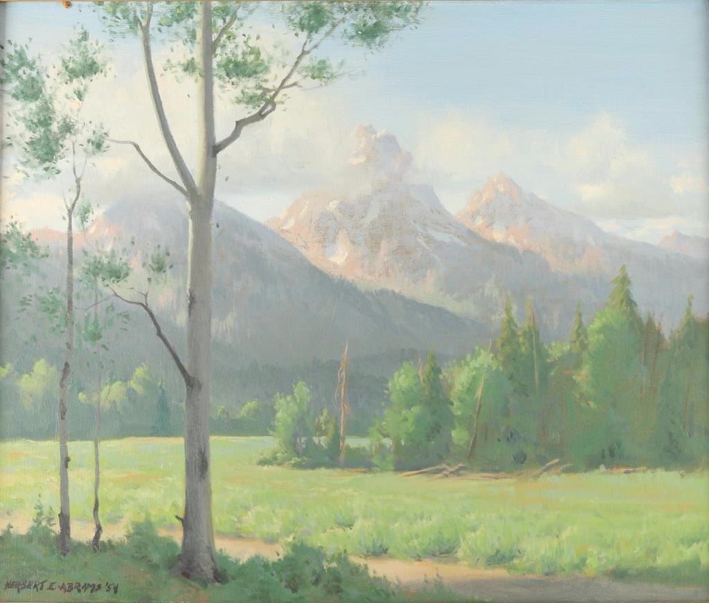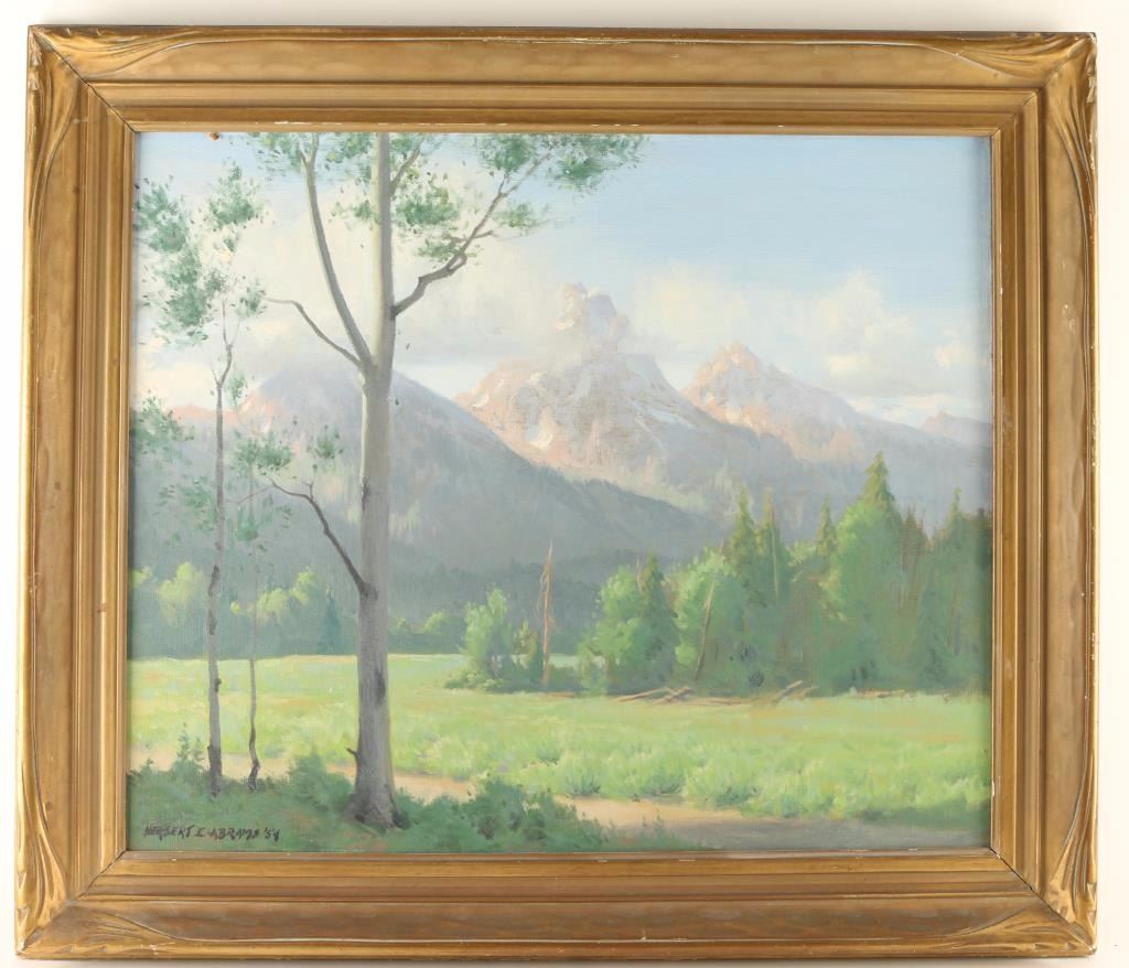 Depicting a mountain landscape. Signed lower left. Image measures 23 1/2"x19 3/4" in gold carved wood frame. Born in Greenfield, Massachusetts,Herbert Adams studied at the Norwich Art School in Connecticut, and in New York at the Pratt Institute and the Art Students League with Frank Vincent Du Mond. He has done numerous portraits of national political figures including those of Presidents Jimmy Carter and George Bush. Herbert is the author of a book titled The Teachings of Frank Vincent DuMond. He has been a resident of Warren, Connecticut. Herbert E. Abrams died of cancer August 29, 2003 at the age of 82.