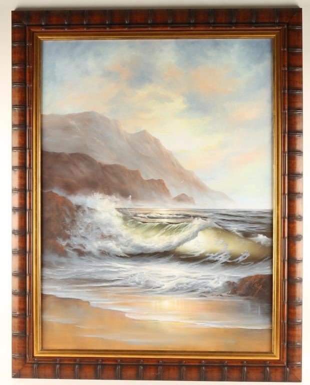 by Olette, signed lower right hand corner depicting an ocean scene with a faux bamboo and gold frame. Image size 39"x29".