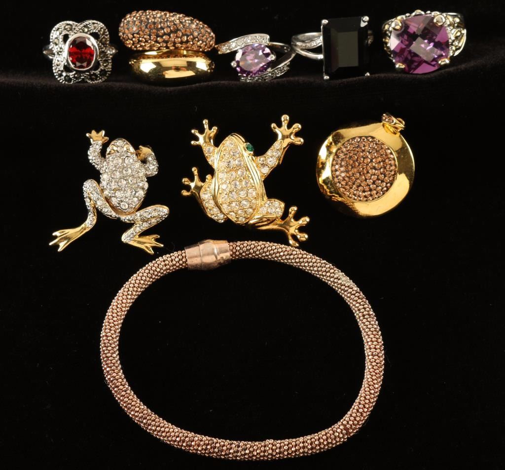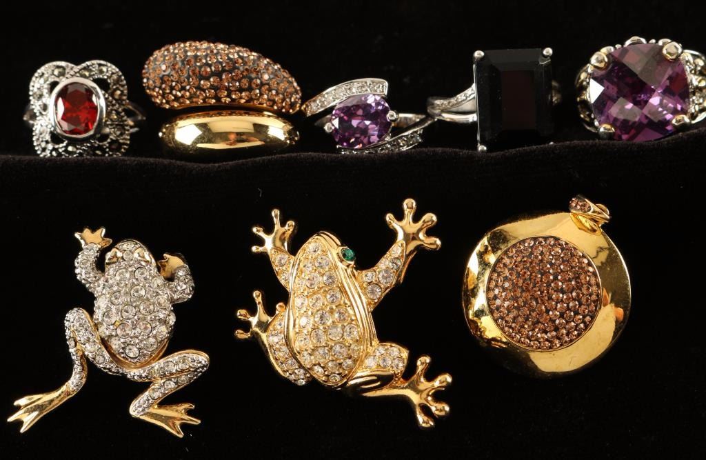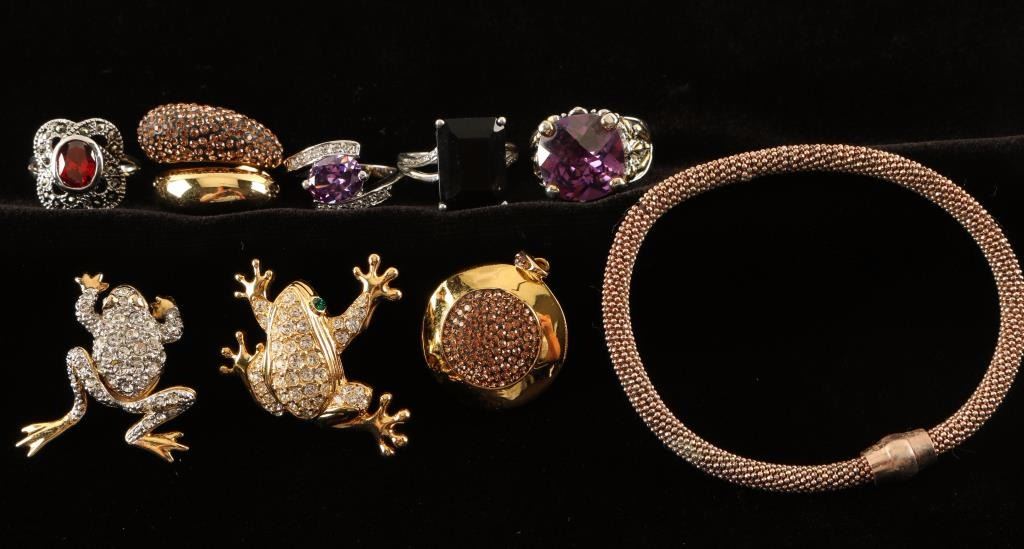 Including: 2 rings with round purple stones, 1 ring with an oval orange stone and floral motif, 1 with large black rectangular stone-all set in silver and a wraparound gold metal ring with orange stones, 1 sparkling frog pin and 1 frog earring, a gold pendant with glittery orange stones and a bronze mesh chain bracelet.