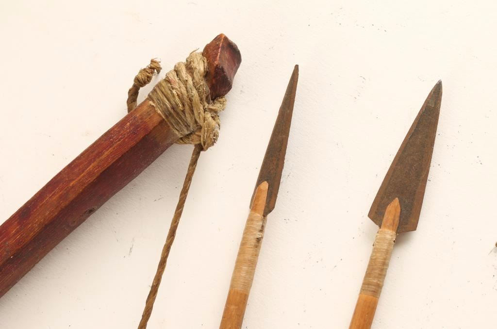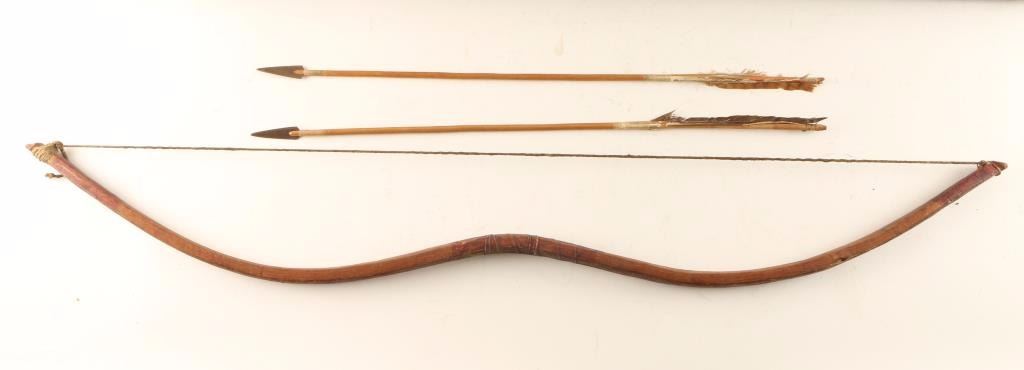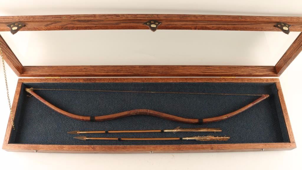 Wood construction bow with an animal skin string-measures 38" overall mounted in an oak shadowbox.