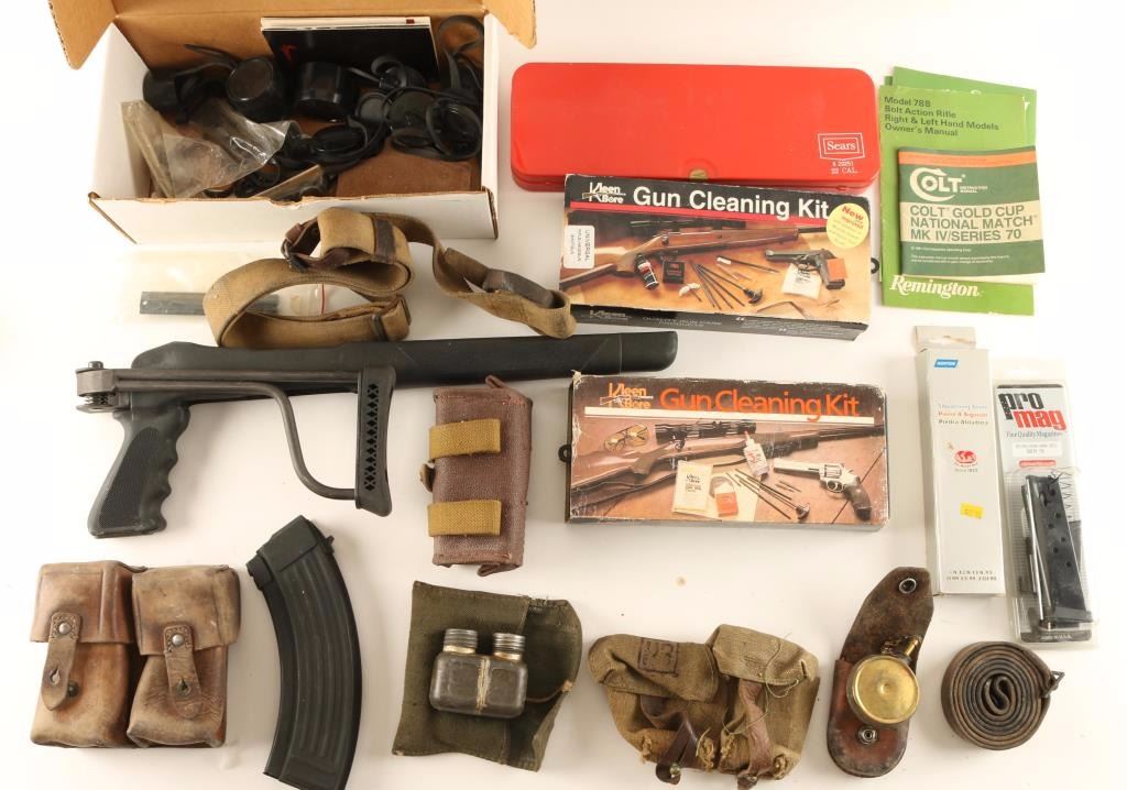 Oilers, mag holders, synthetic stock, cleaning kits, 9mm Helwin mag, sharpening stone, manuals, scope covers, and more.